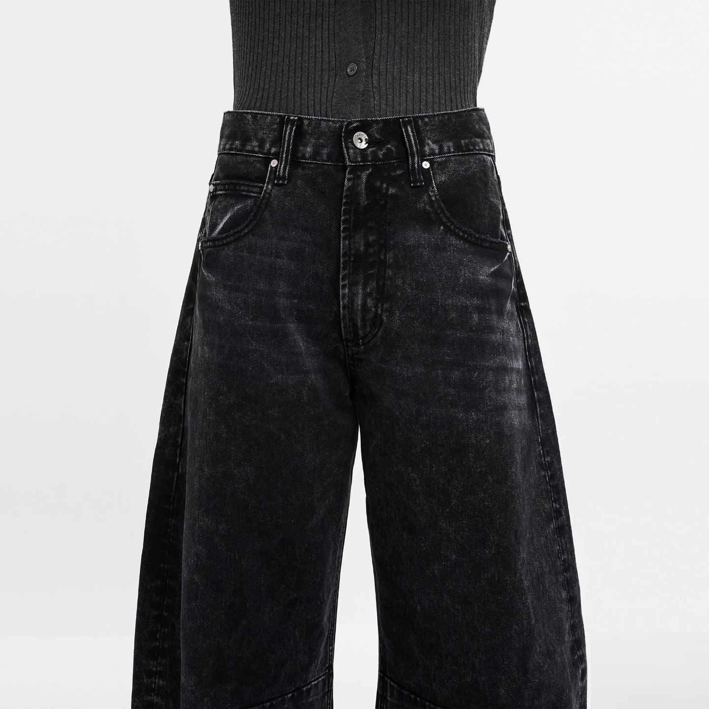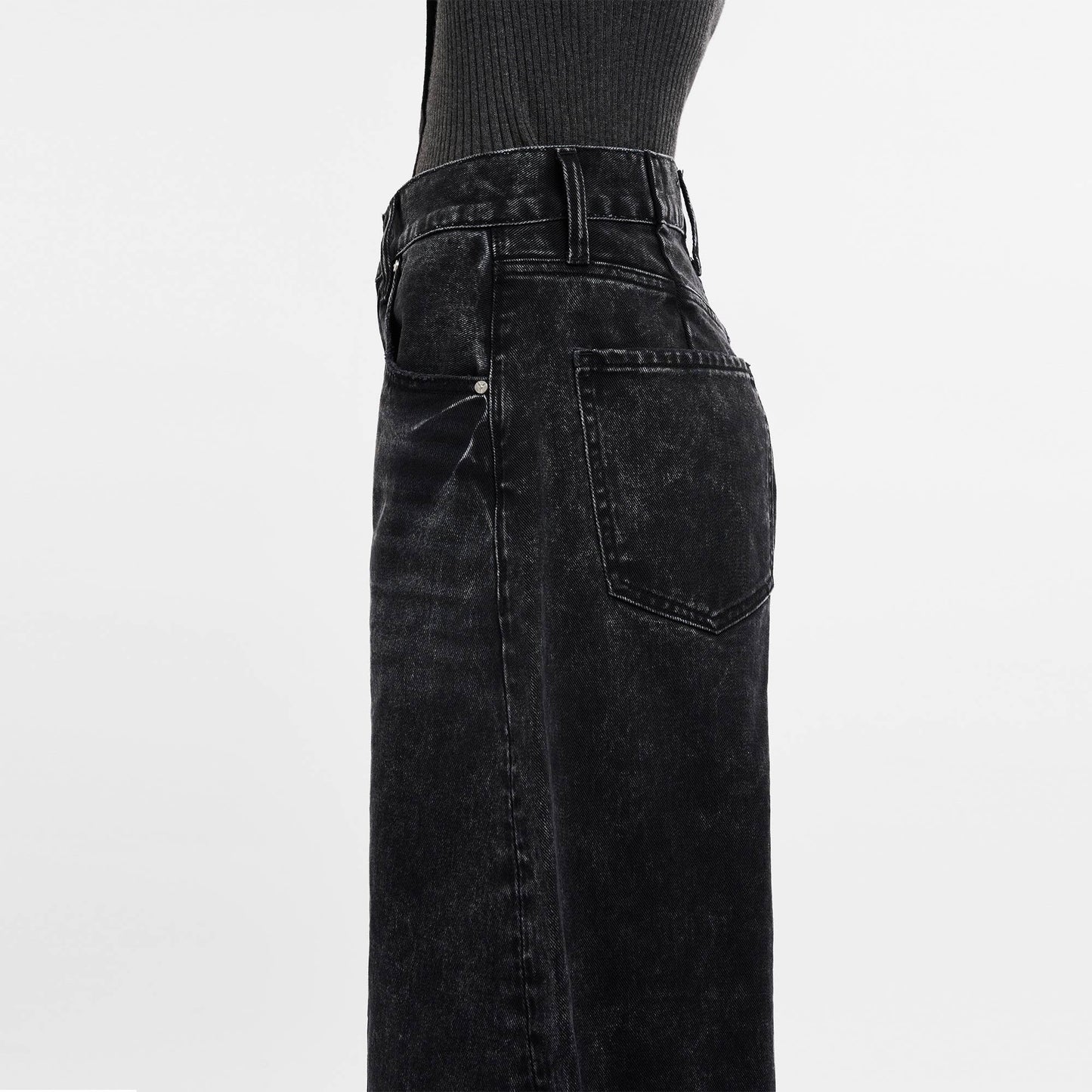 Rigid denim, five pockets, zipper fly.