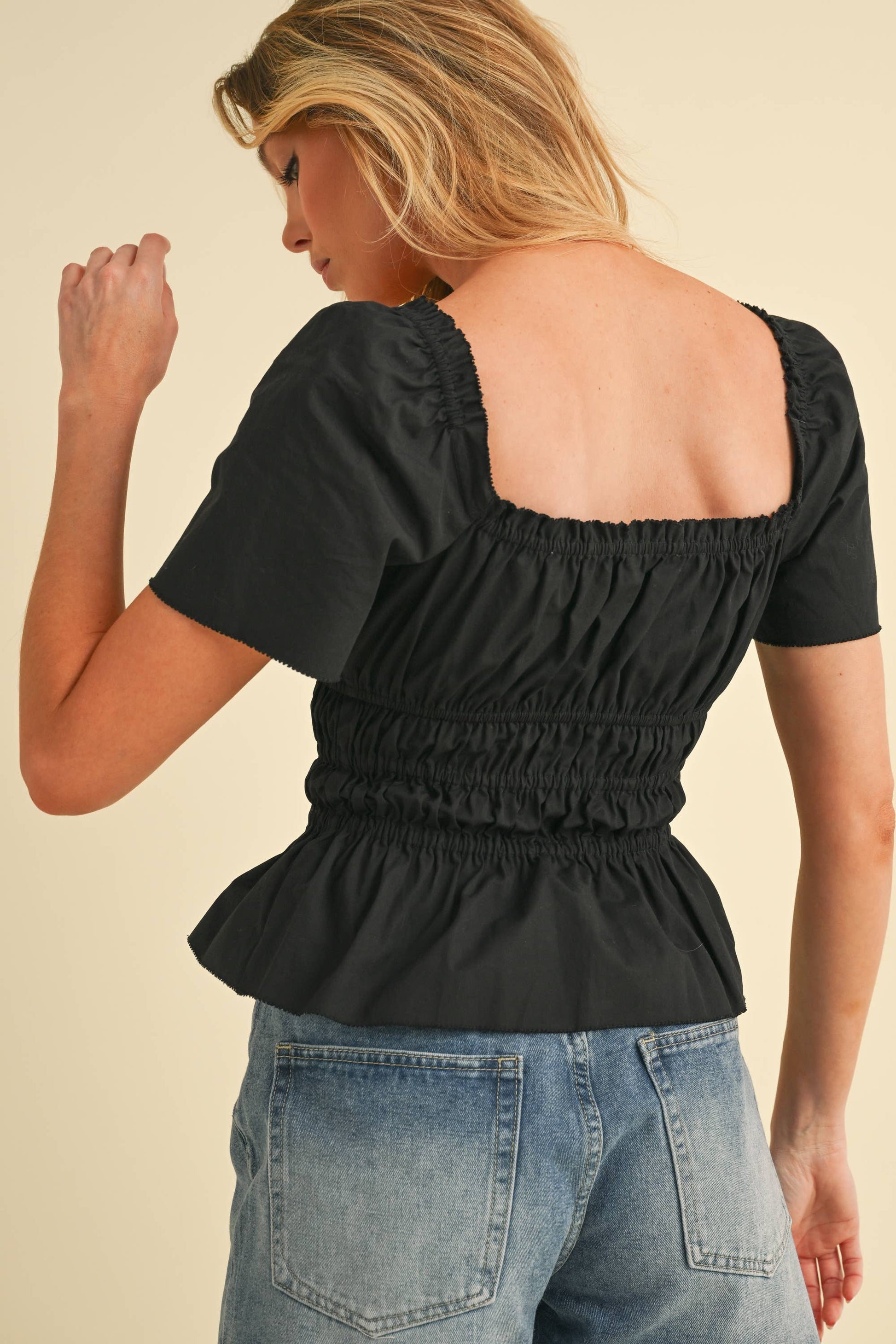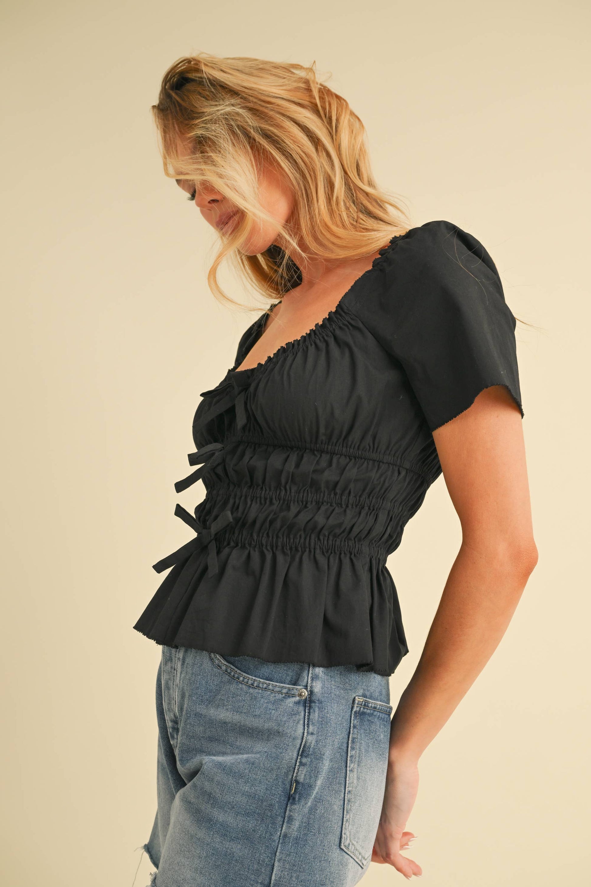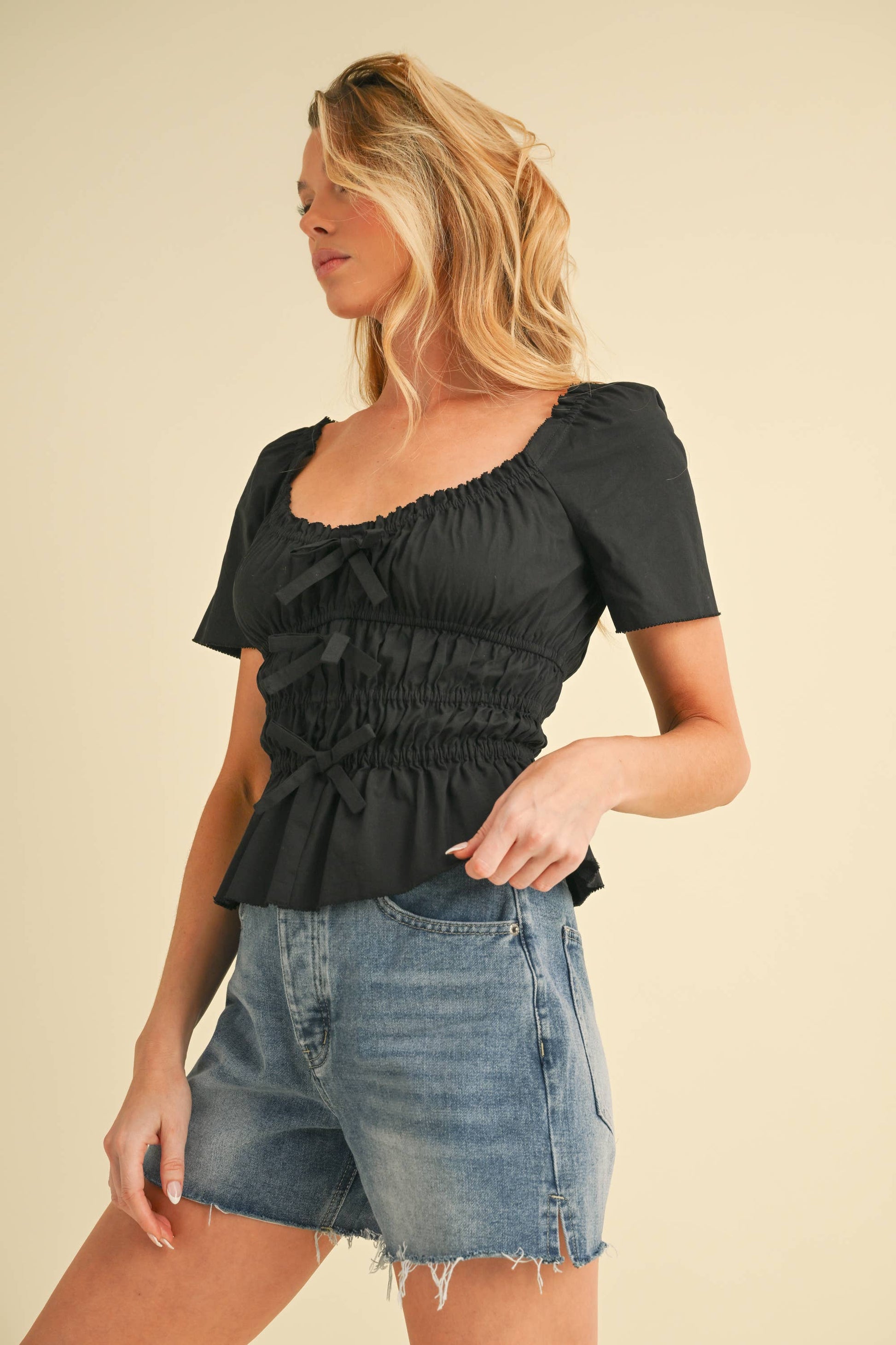 Charming and feminine, this top is crafted with delicate smocking and bow accents for a perfectly romantic feel. With puffed sleeves and a peplum hem, it’s made for those carefree, sunny-day adventures.