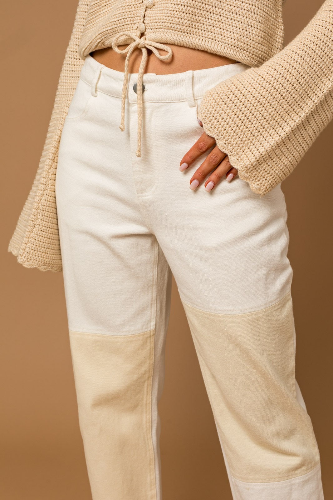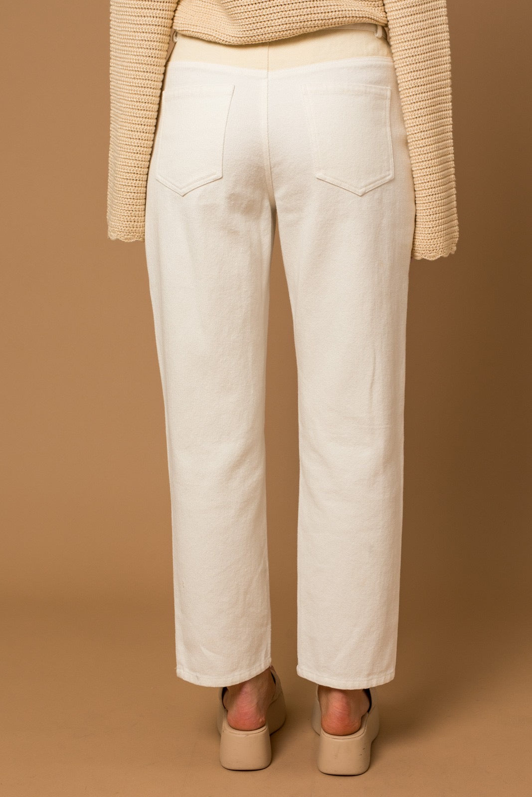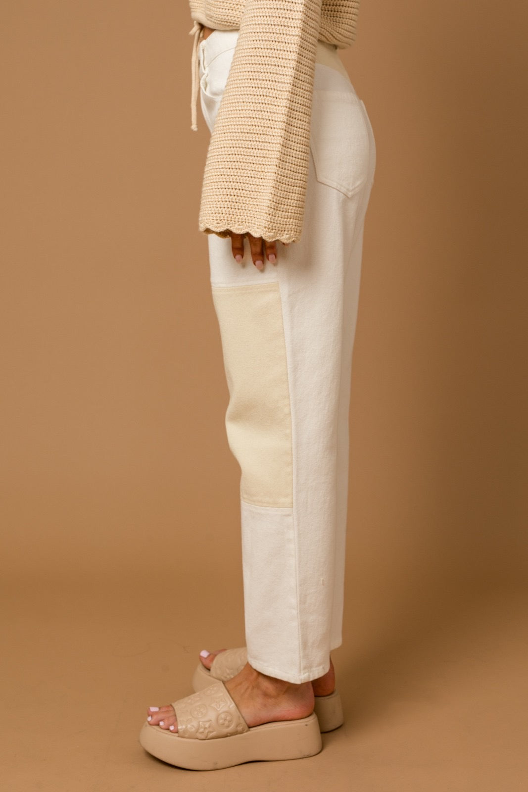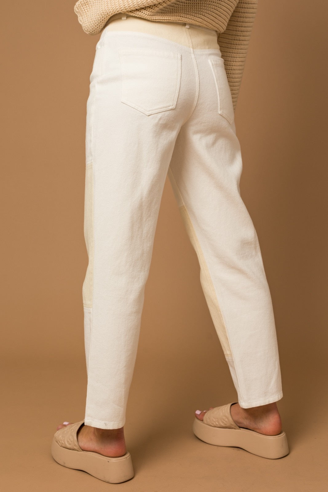 Off-white with sand color patch details on the legs and back waistband.