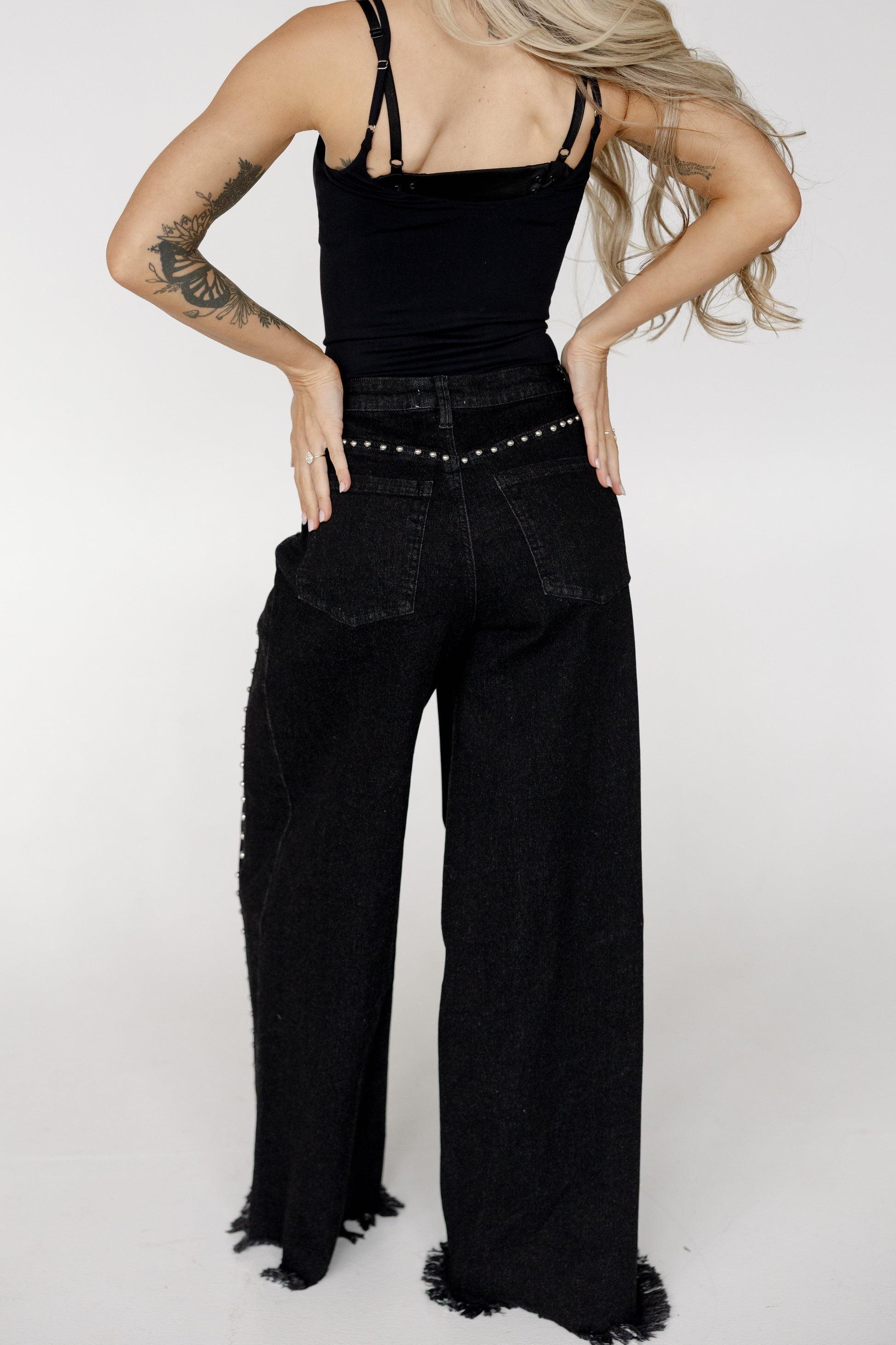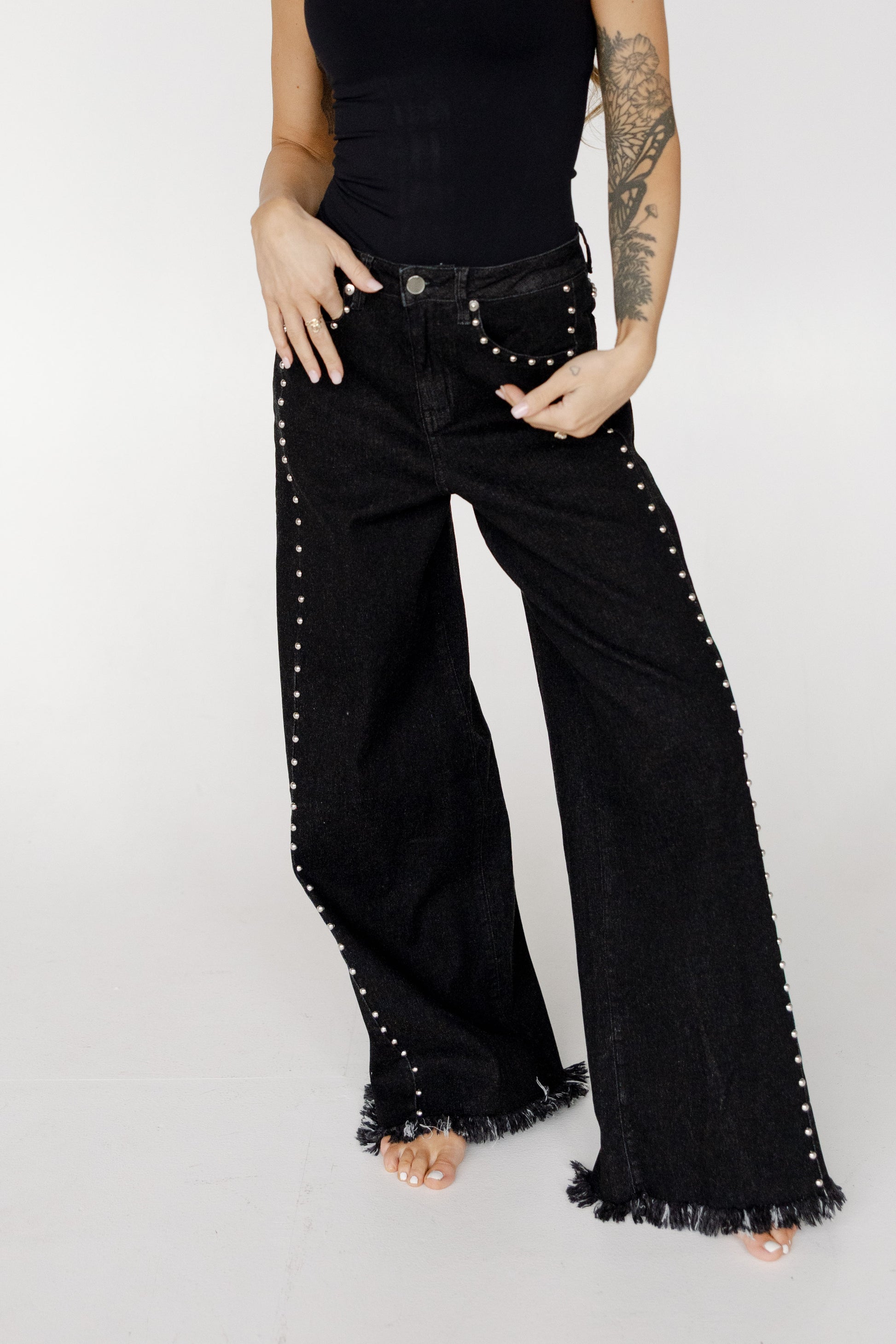 Premium black wide leg denim pants with silver studded detail down the legs.