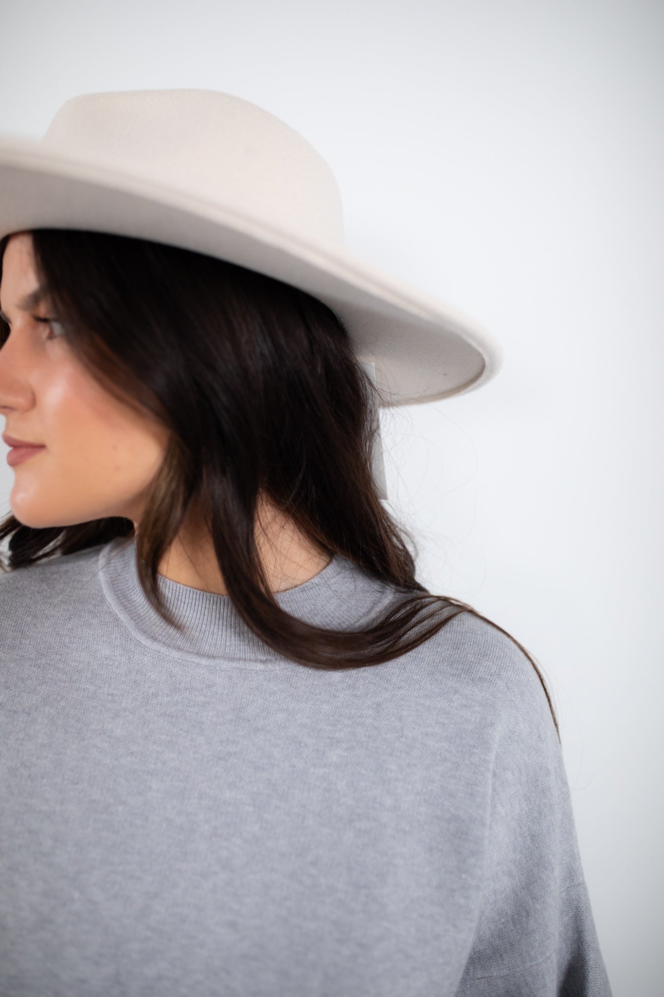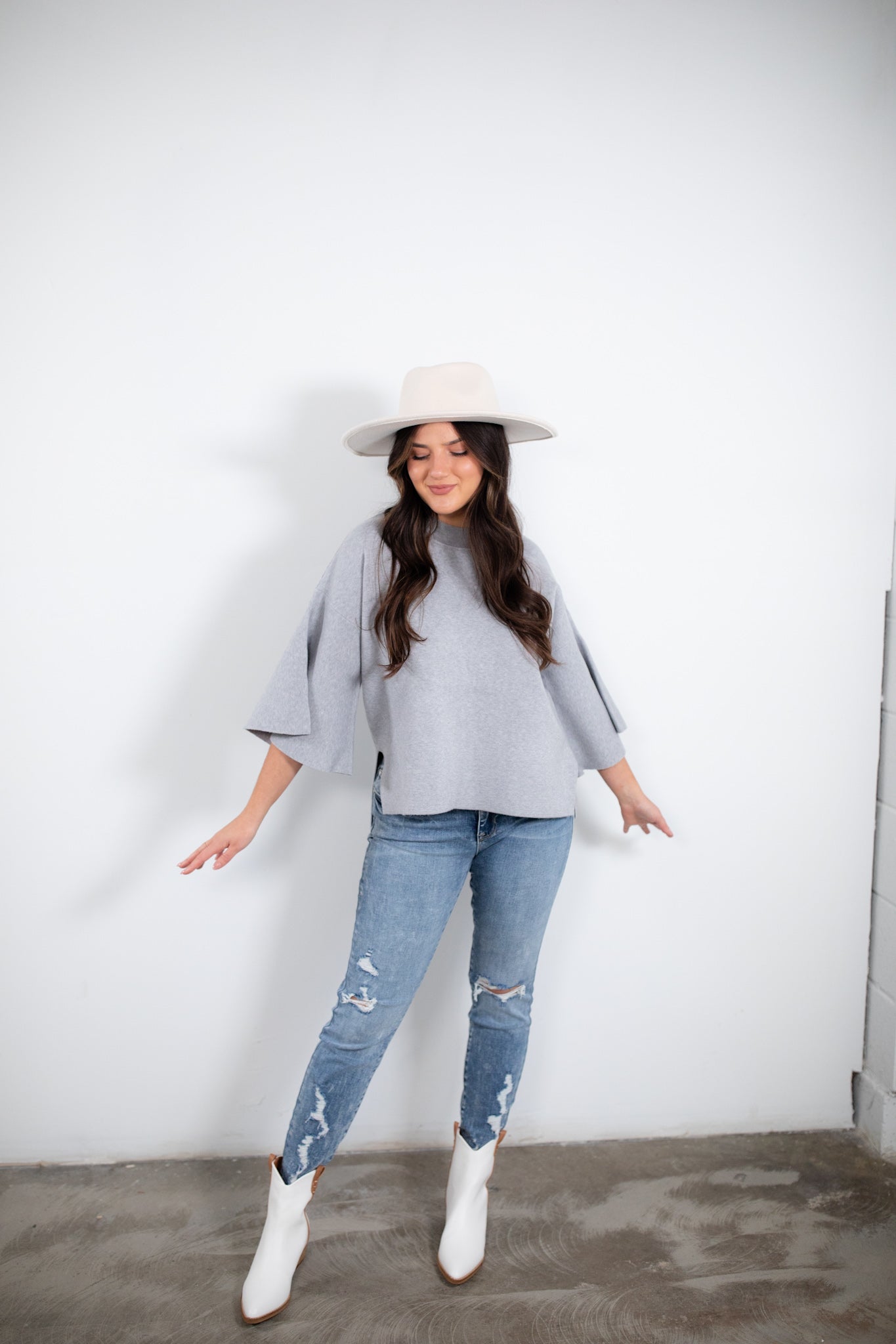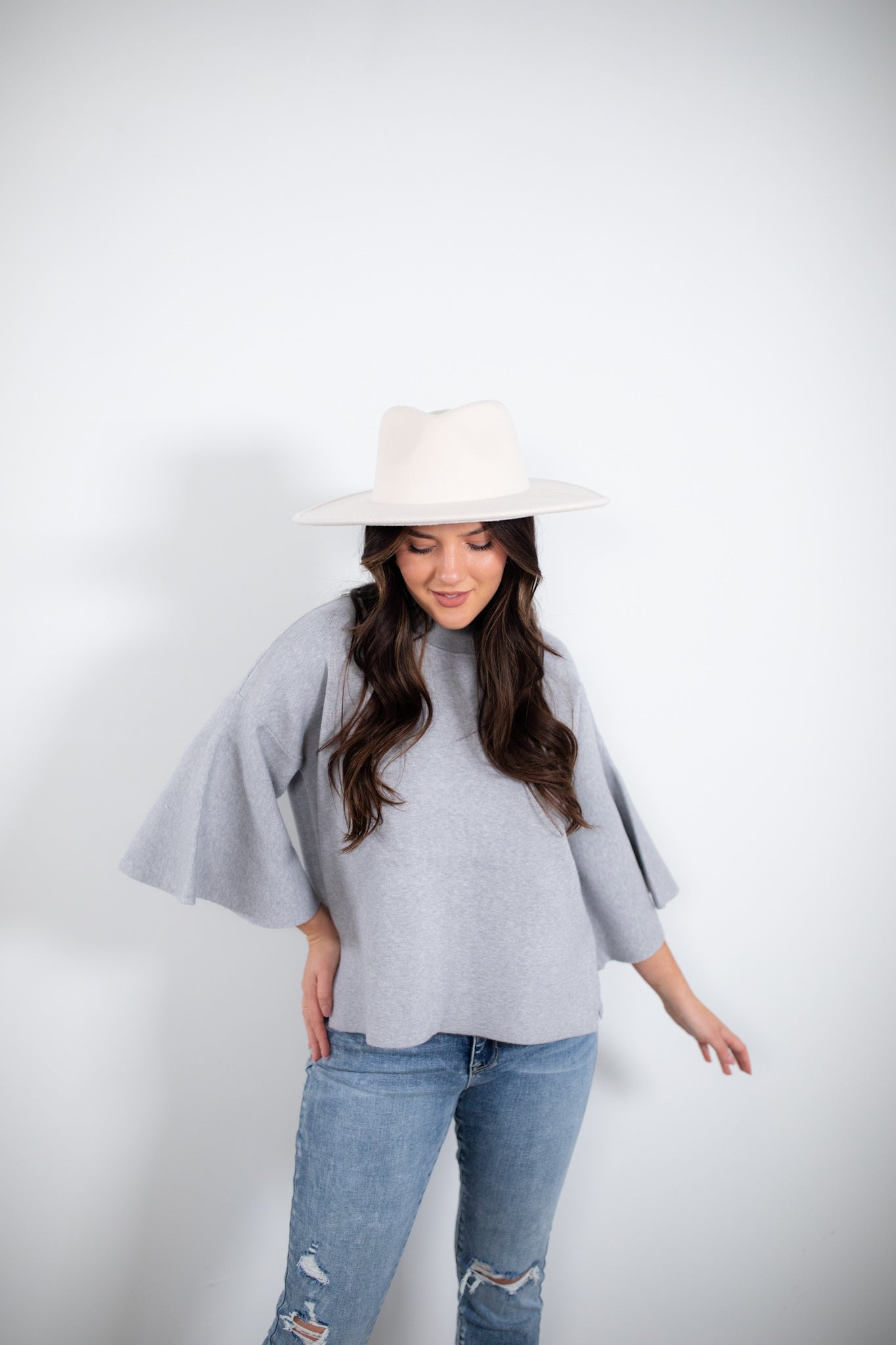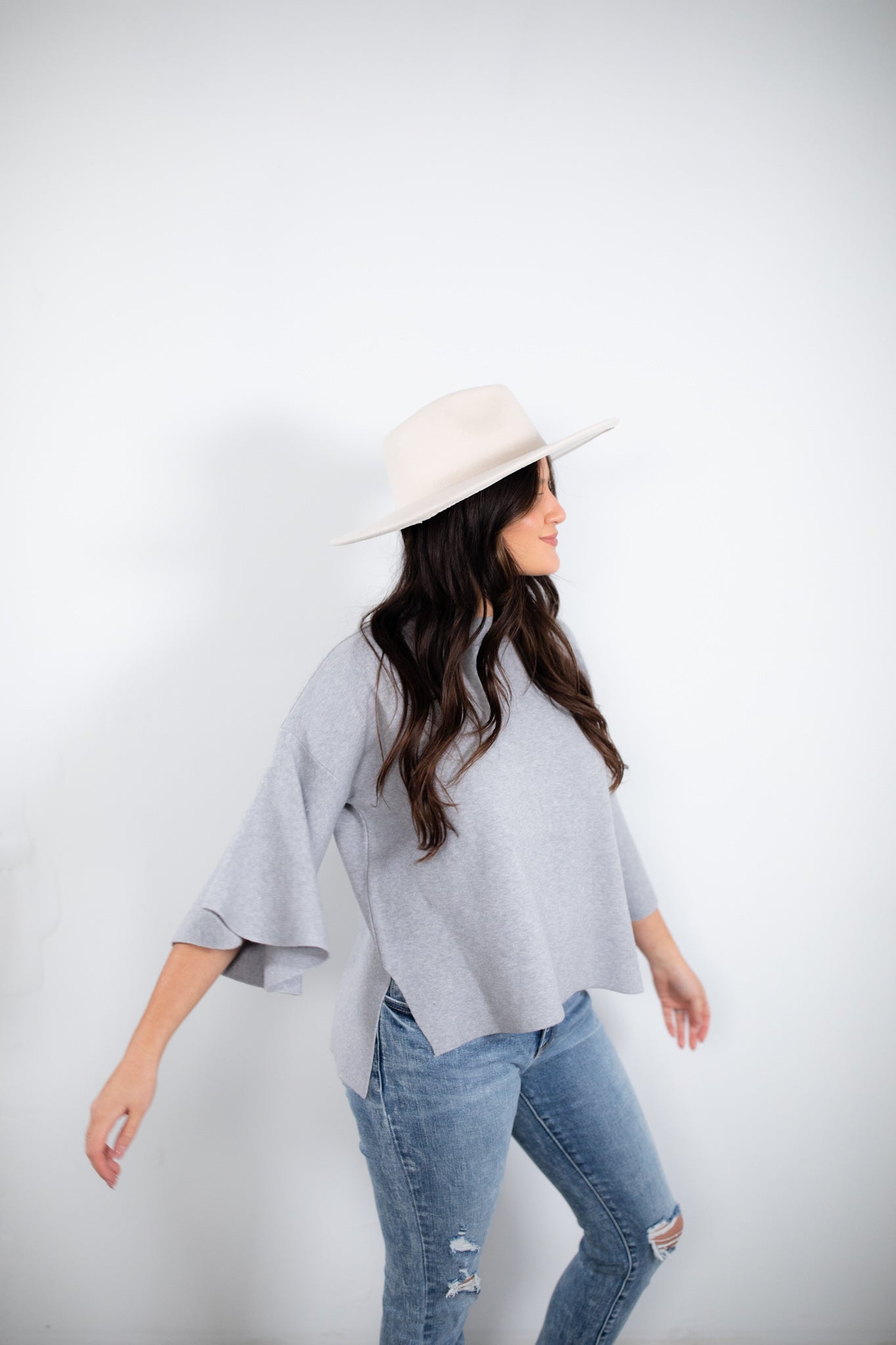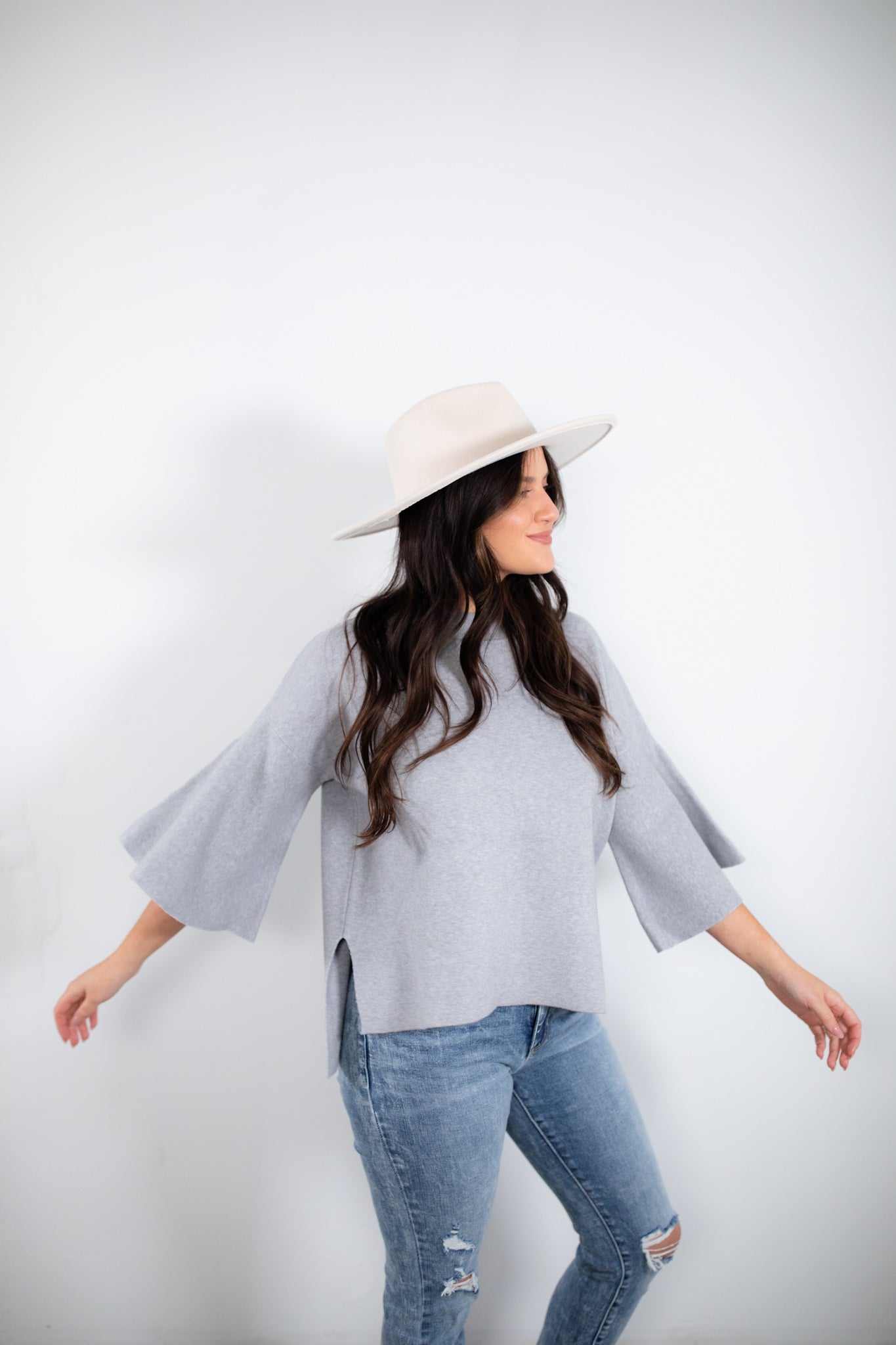 Ribbed crew neck sweater with 3/4 bell sleeve detail.