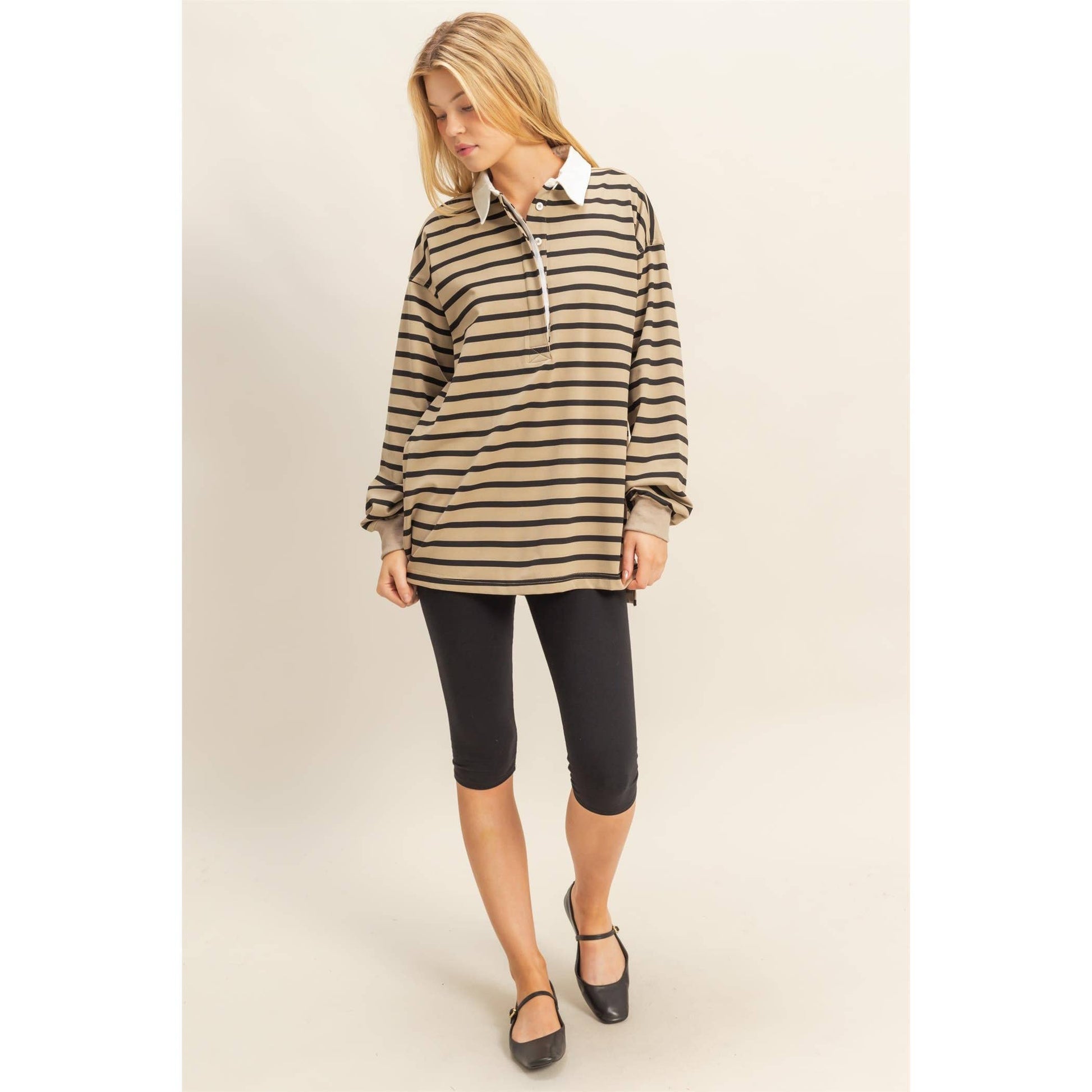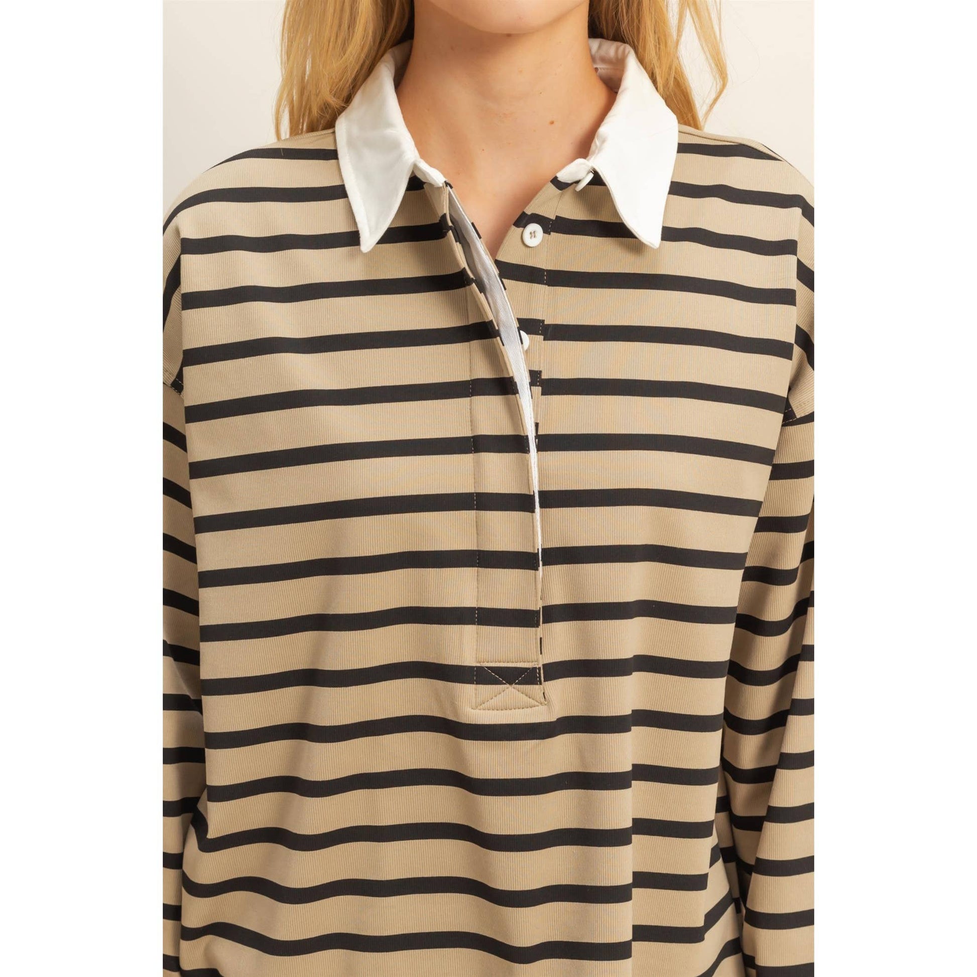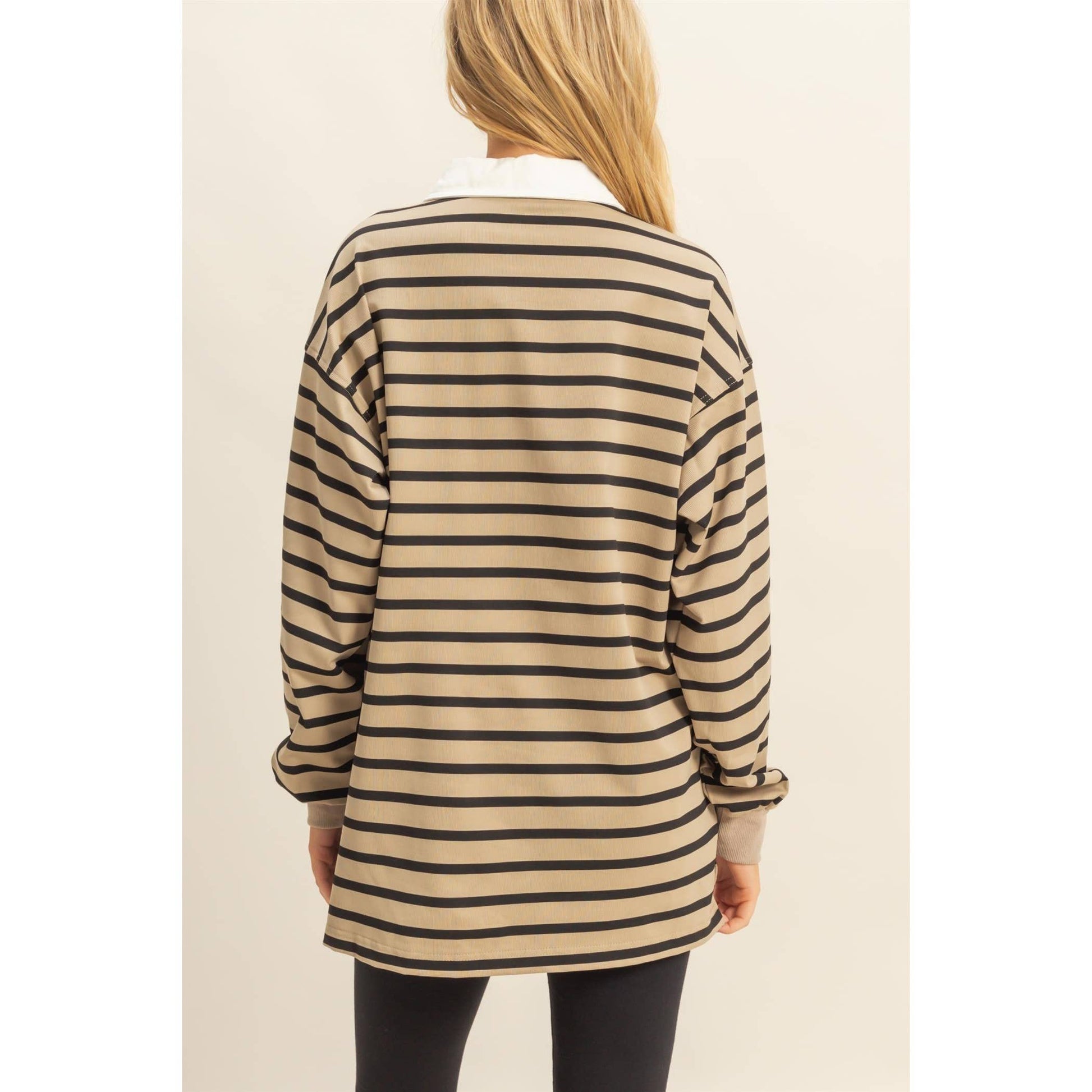 Trendy rugby stripe with a contrasting collar.