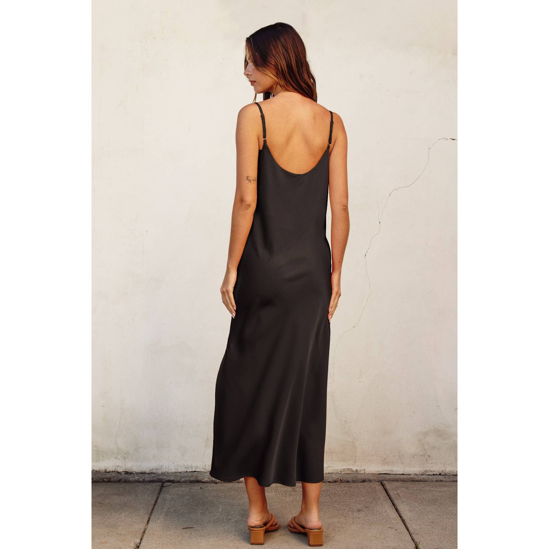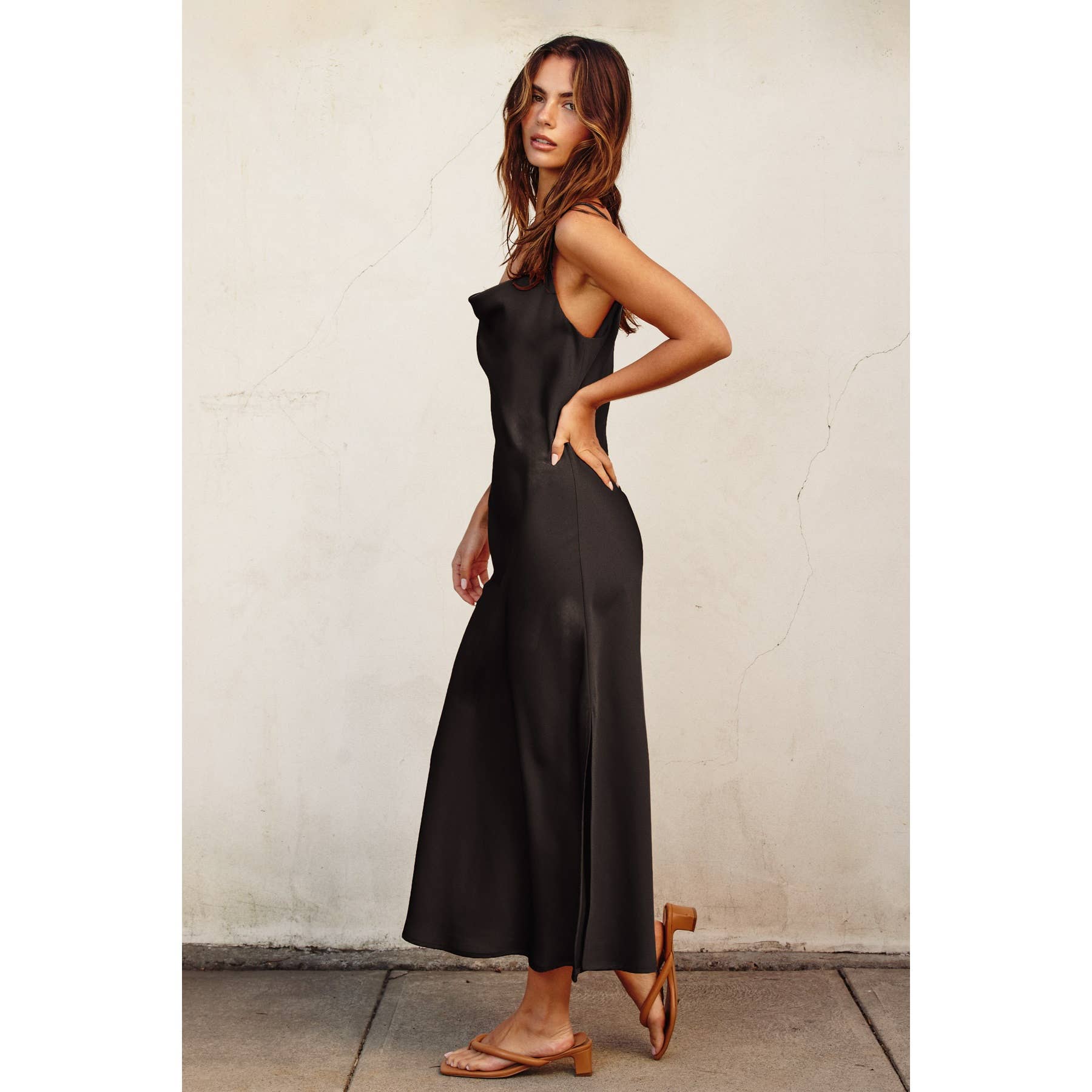 Slip-on midi dress with a 90s inspired cowl neck design and scoop back.