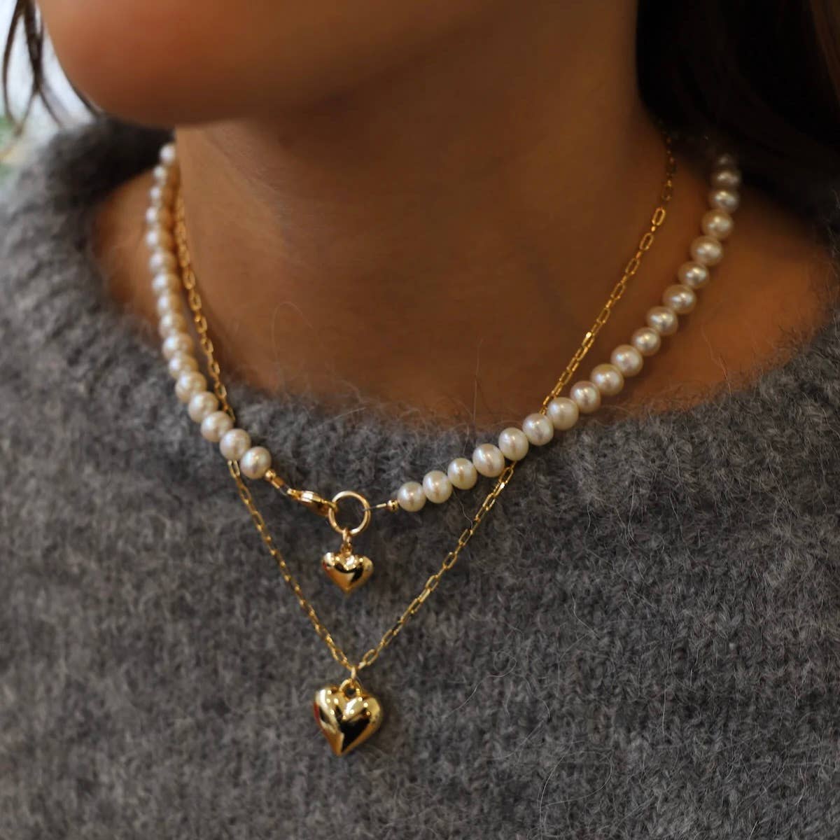A freshwater pearl necklace with a front clasp with a gold puff heart.