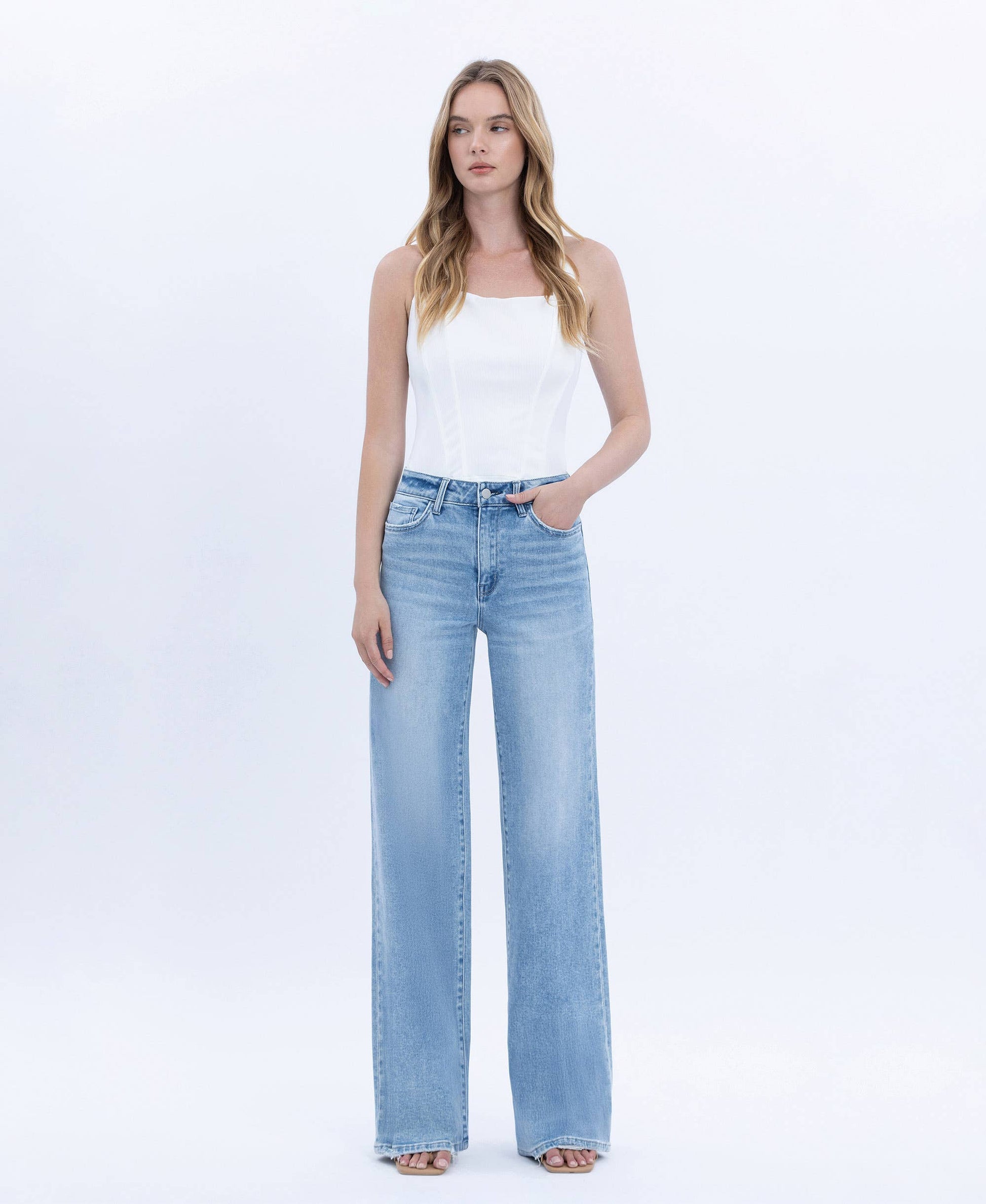 High rise, full length jeans.