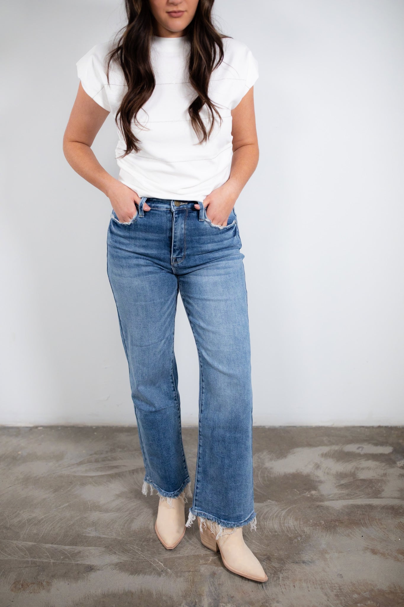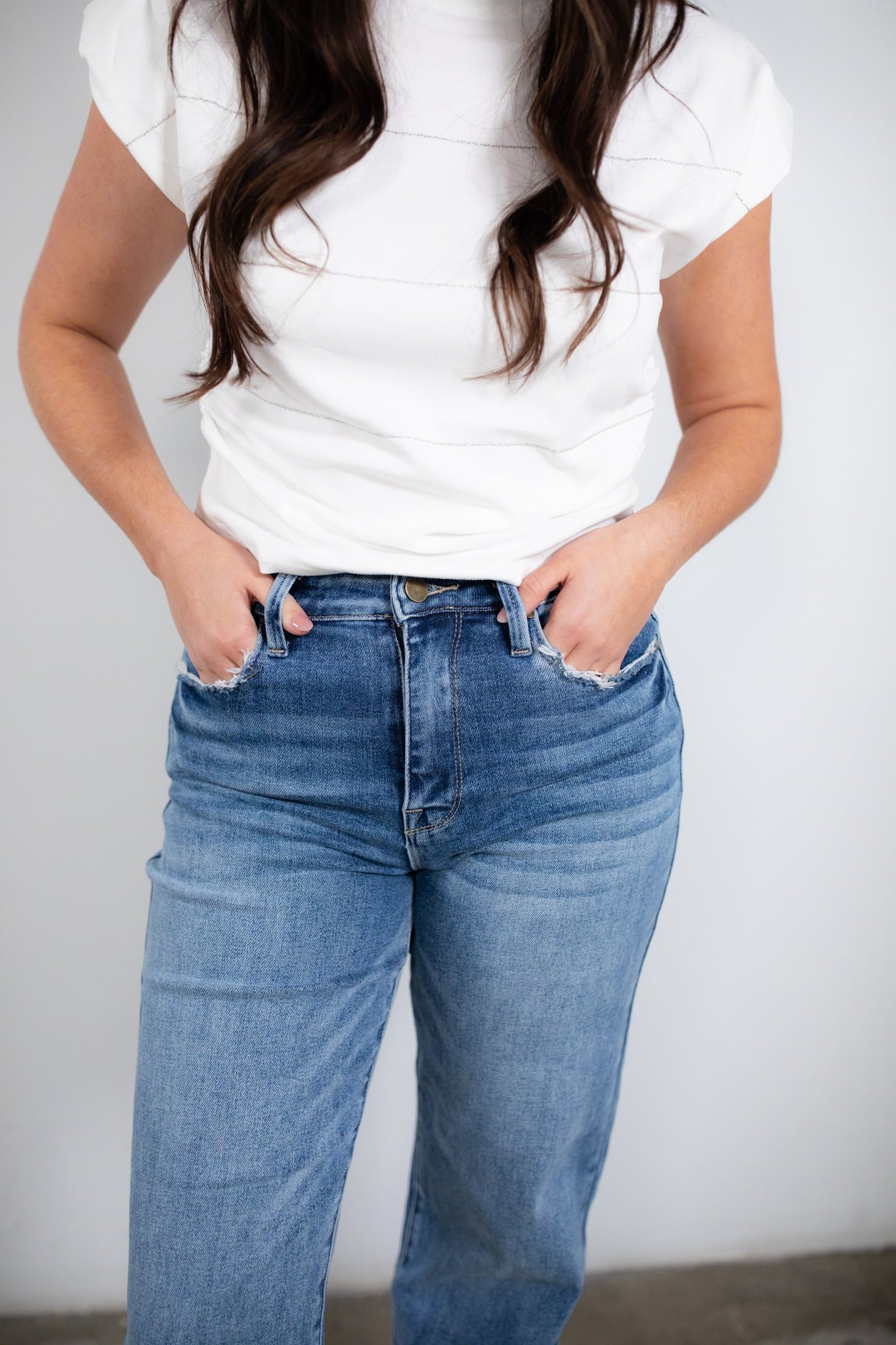High rise stretch classic straight denim.
