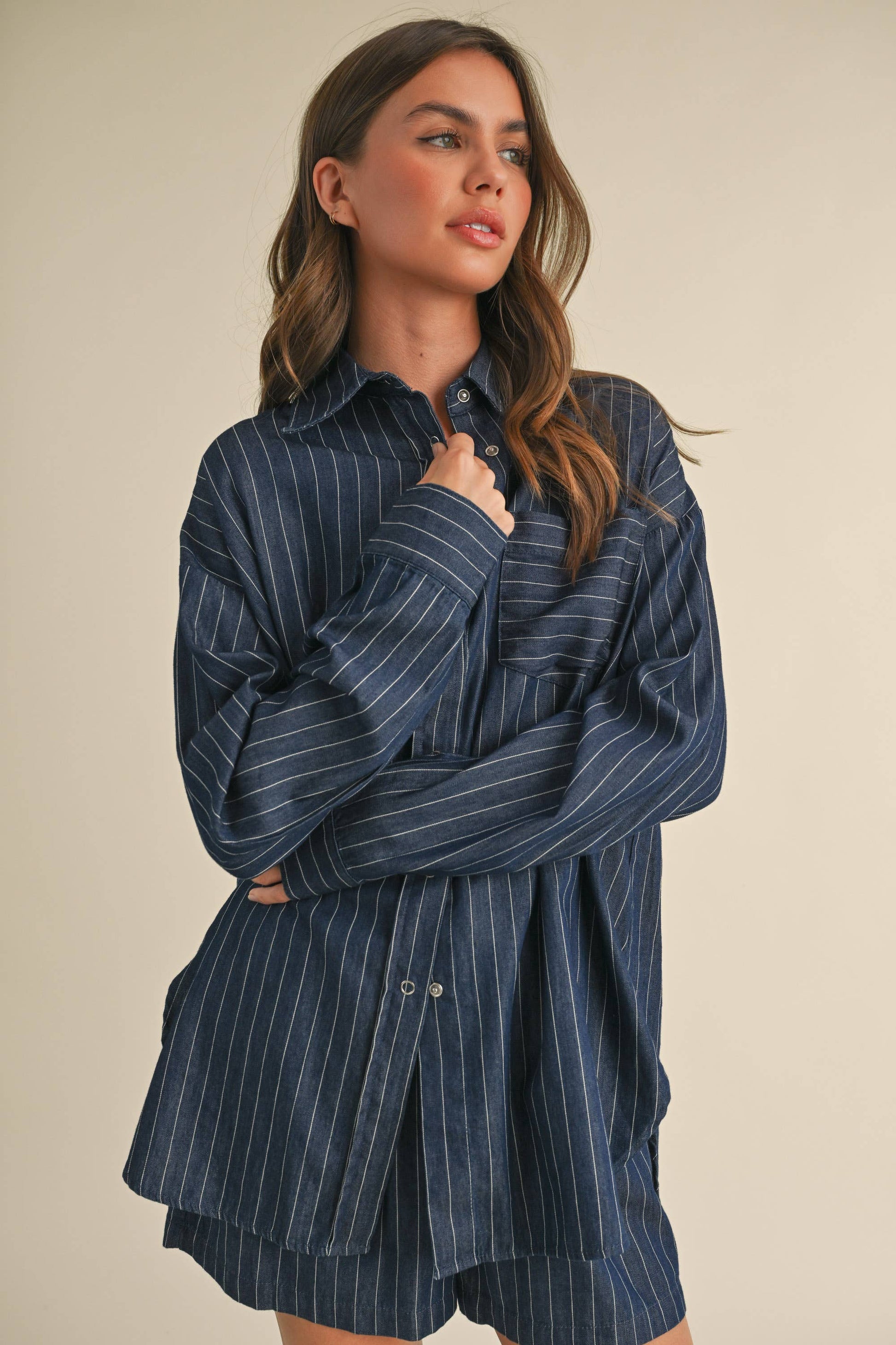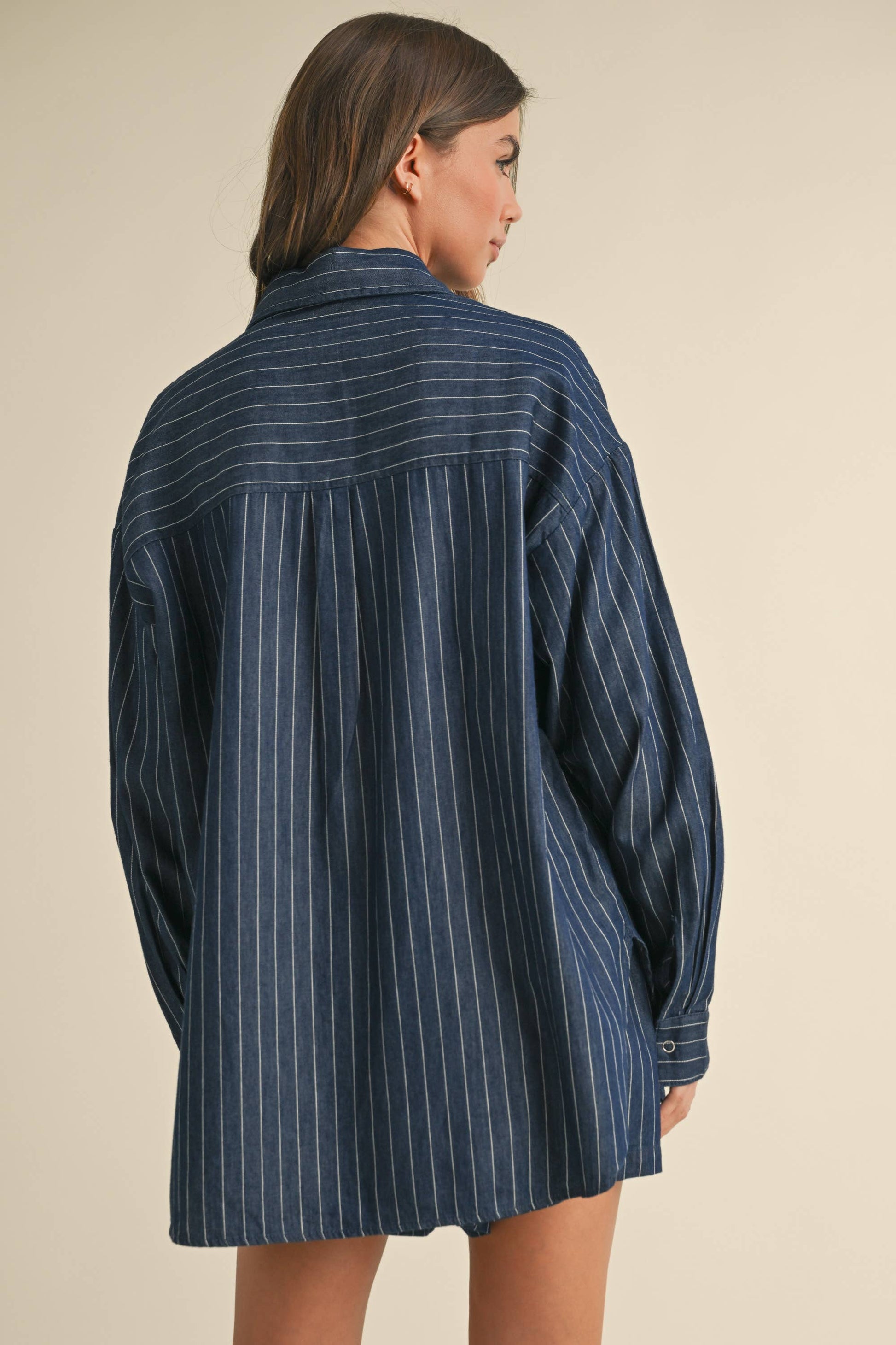 Pinstripe long sleeve button down top.