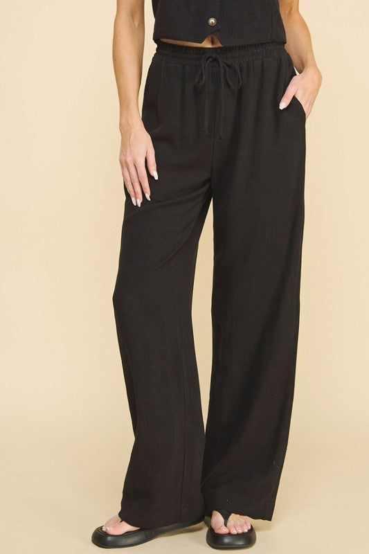 Soft linen blend pants with elastic waist.