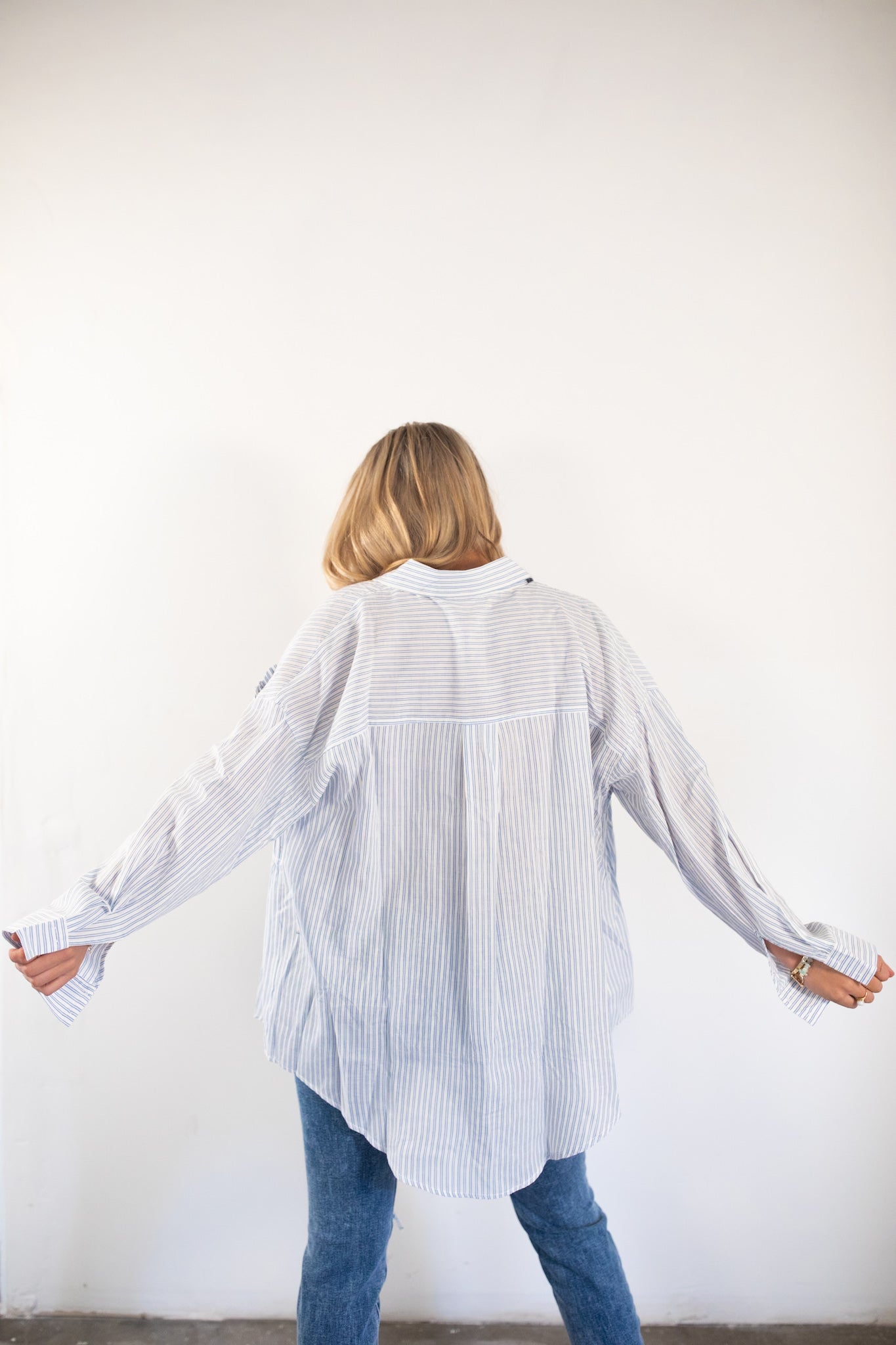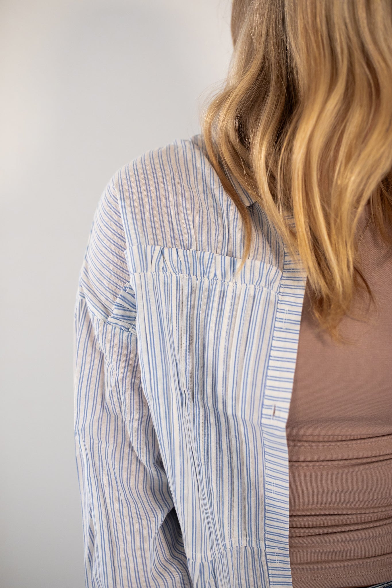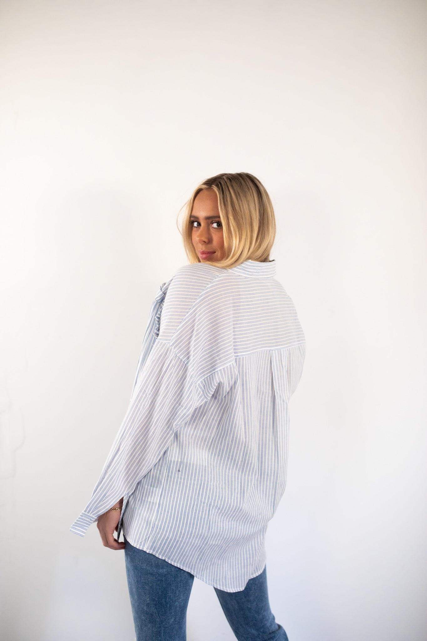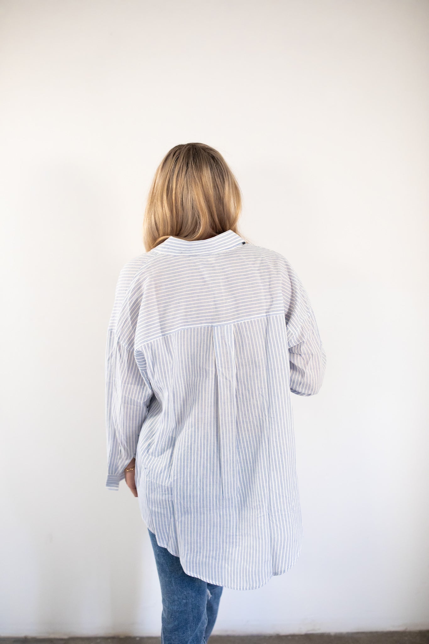 Lightweight blue and white pintstripe button up top.