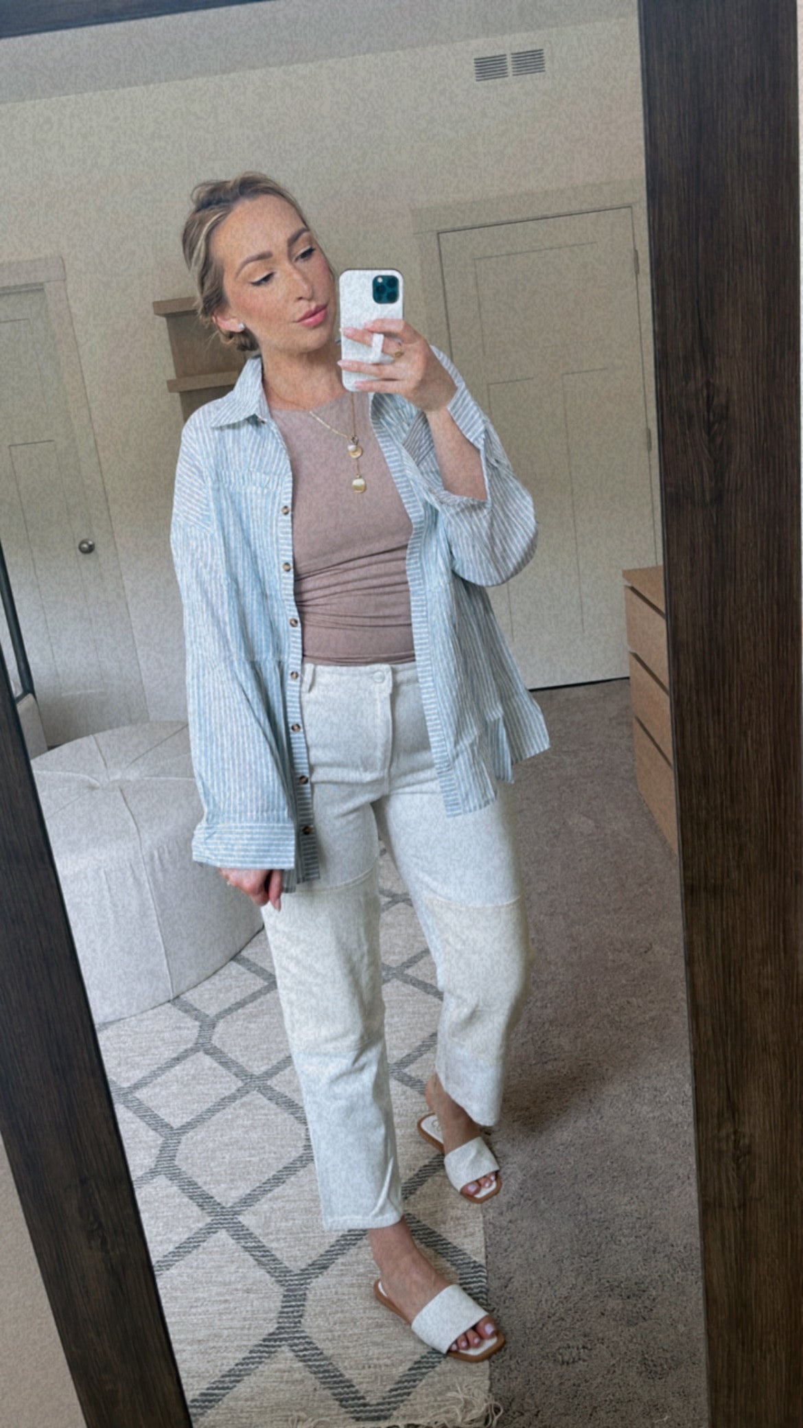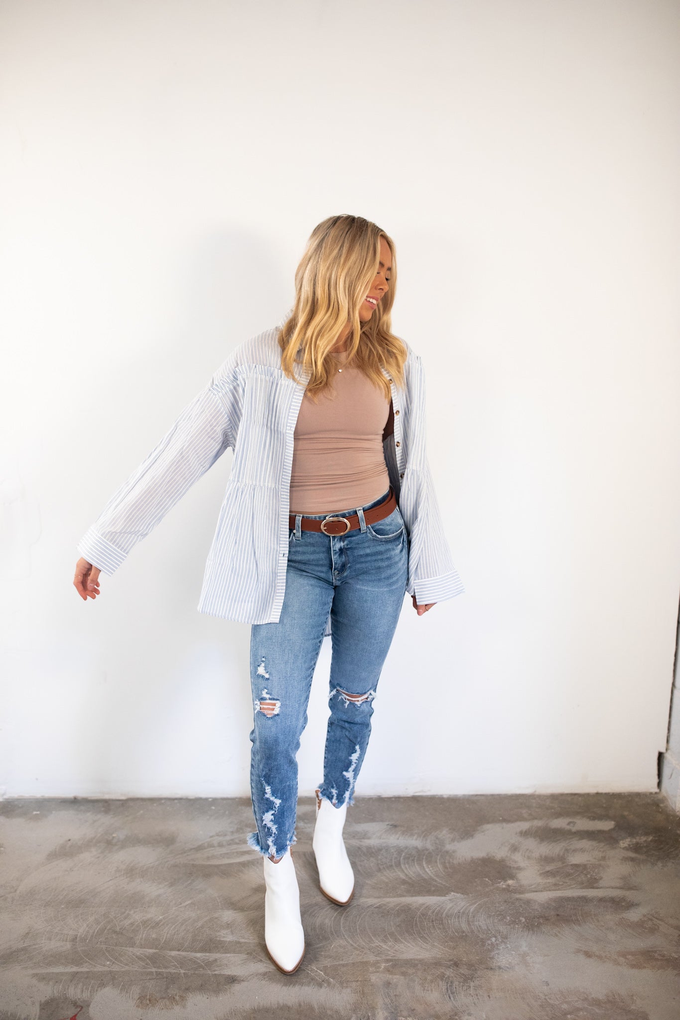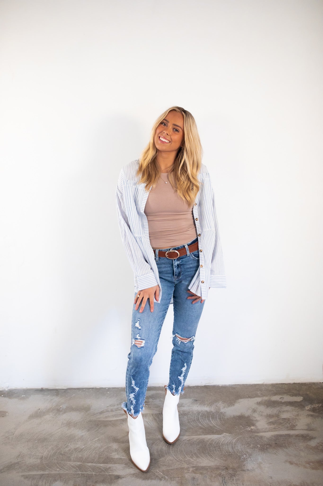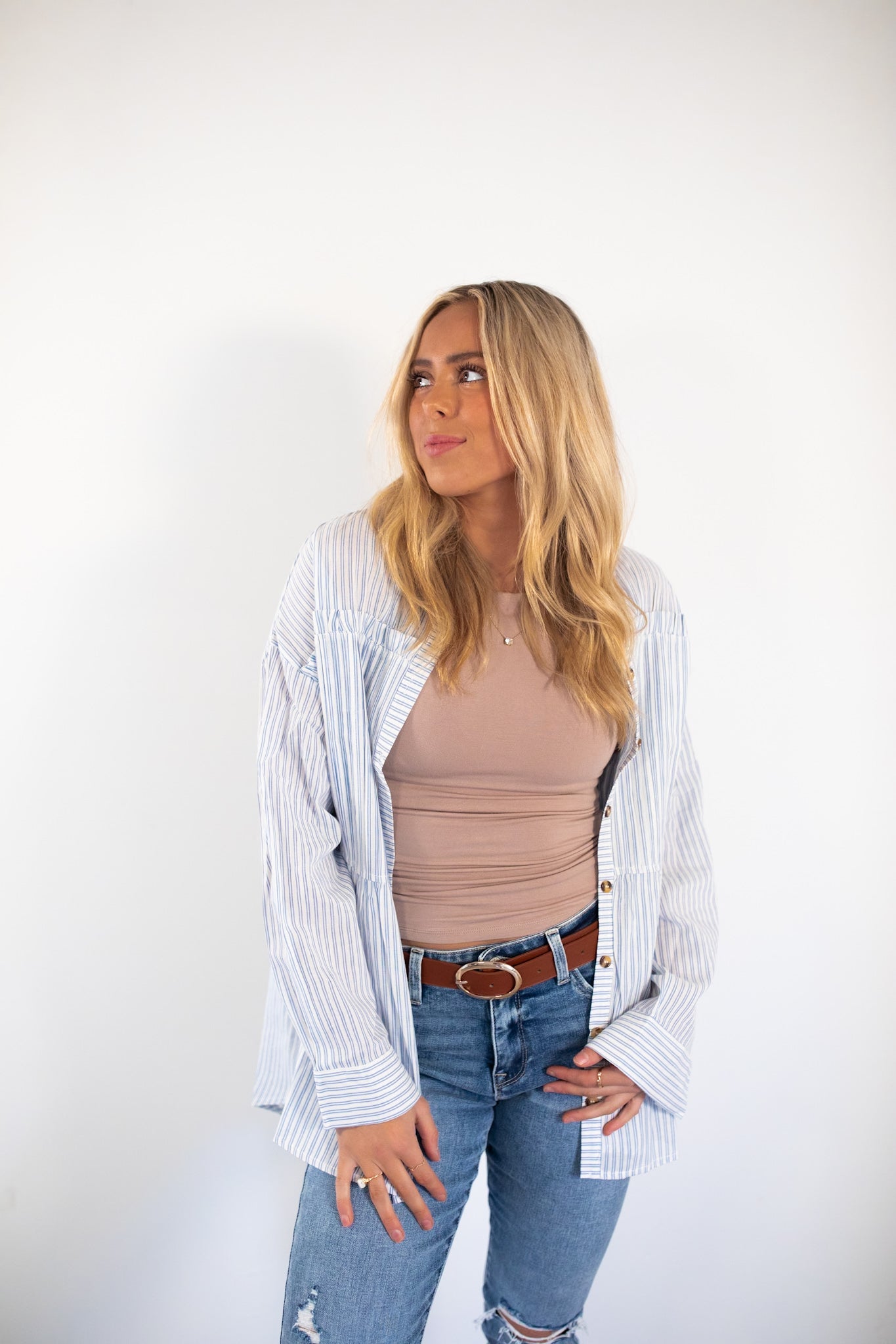 Lightweight blue and white pintstripe button up top.