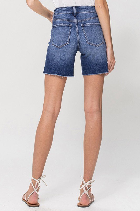 Mid-rise, midi-length short.
