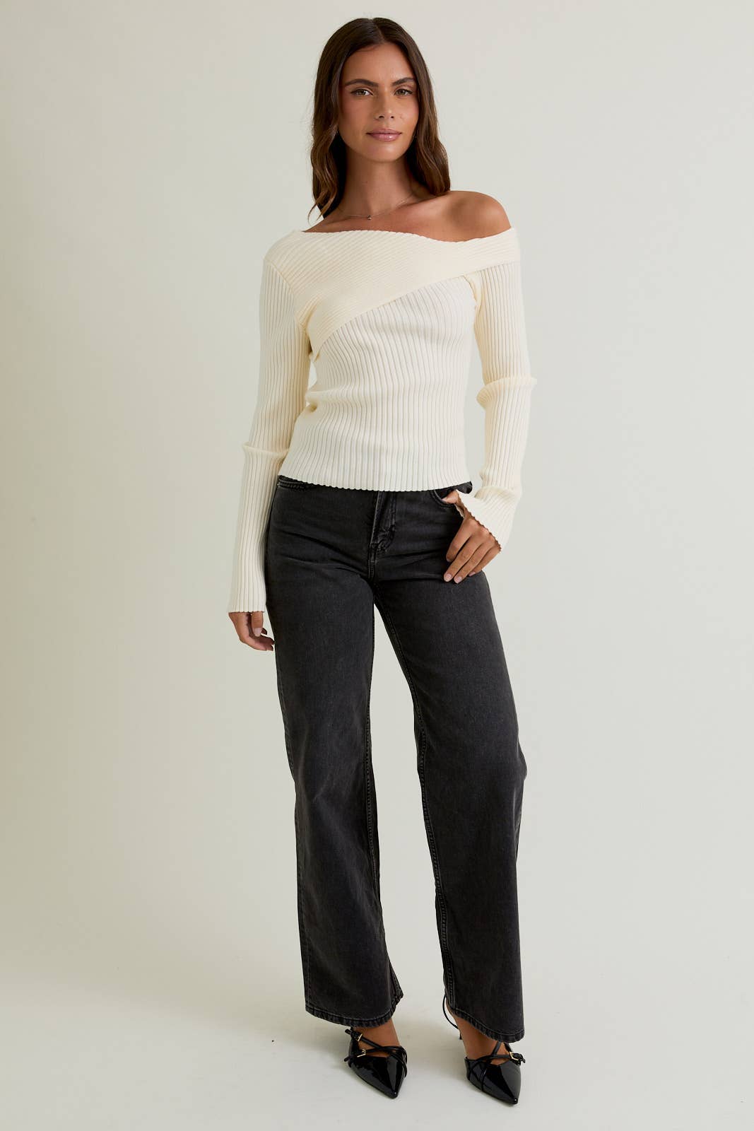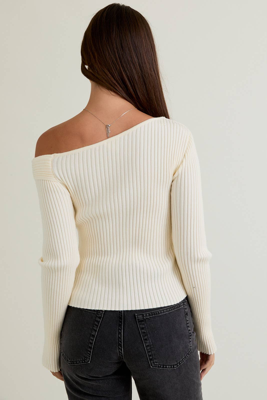 Buttery soft rib knit sweater top with asymmetrical exposed shoulder detail.