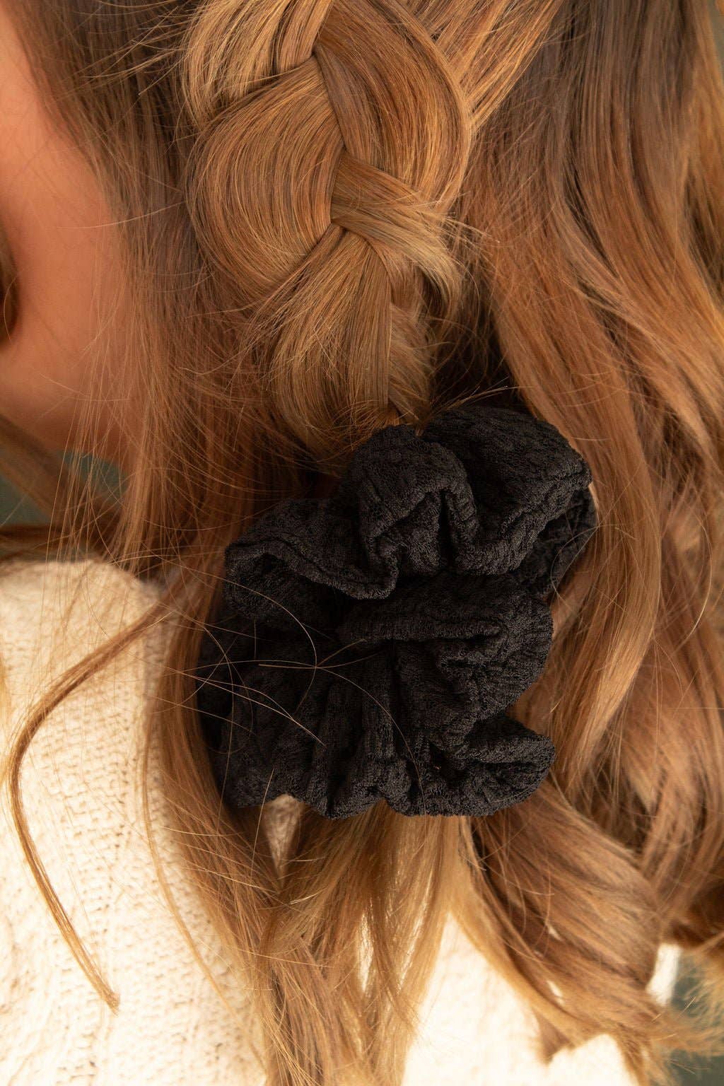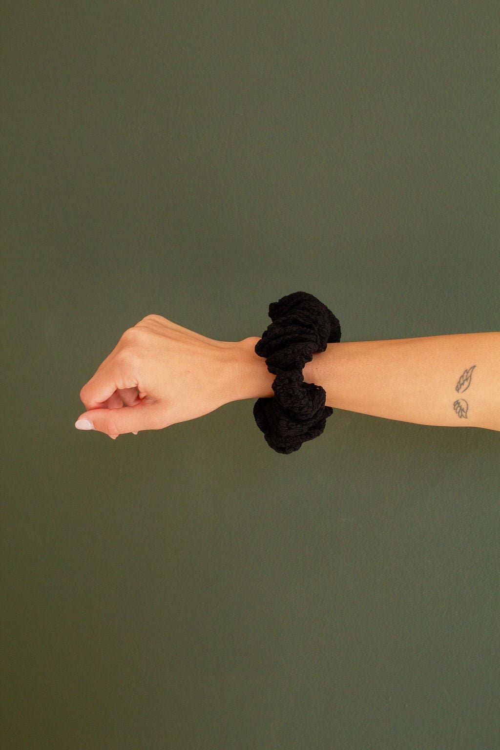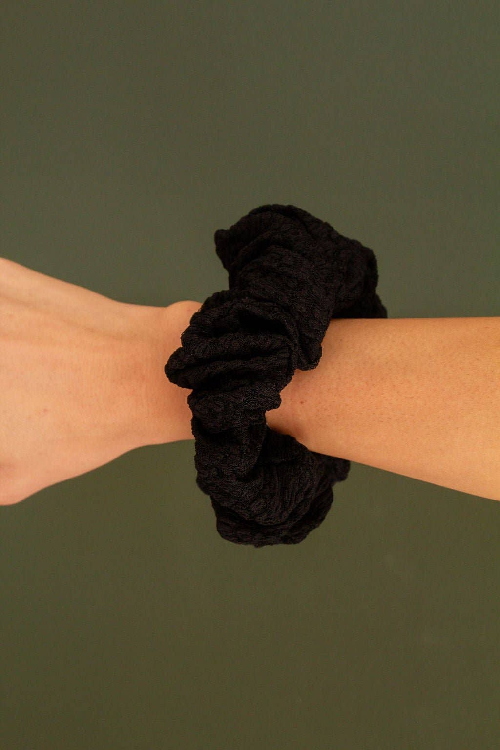 Jumbo scrunchie made from thick, stretchy lace fabric.