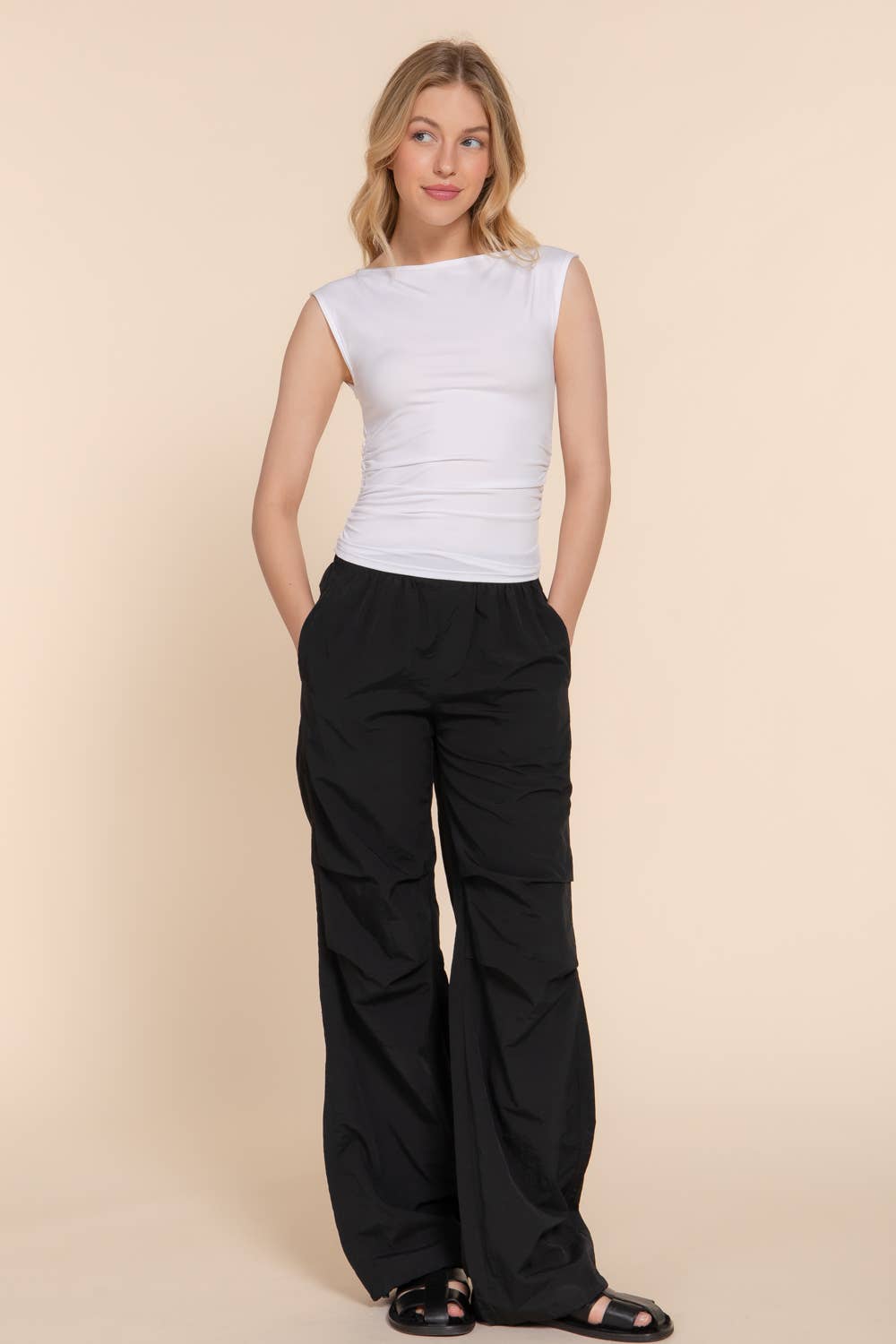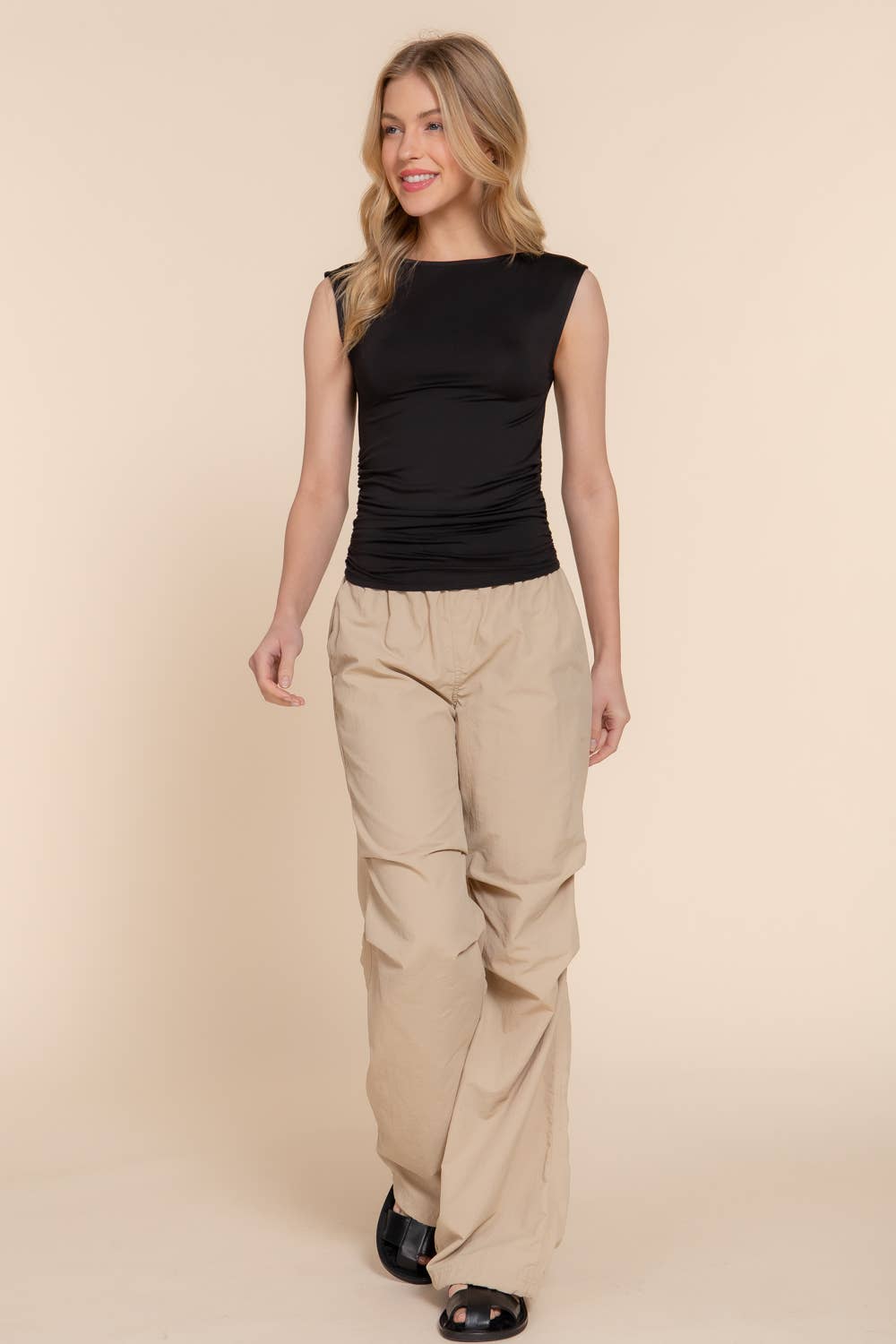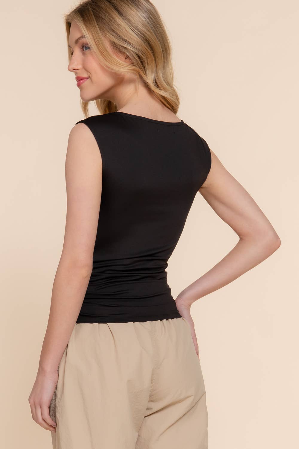 Sleeveless top with boat neck and side shirring detail.