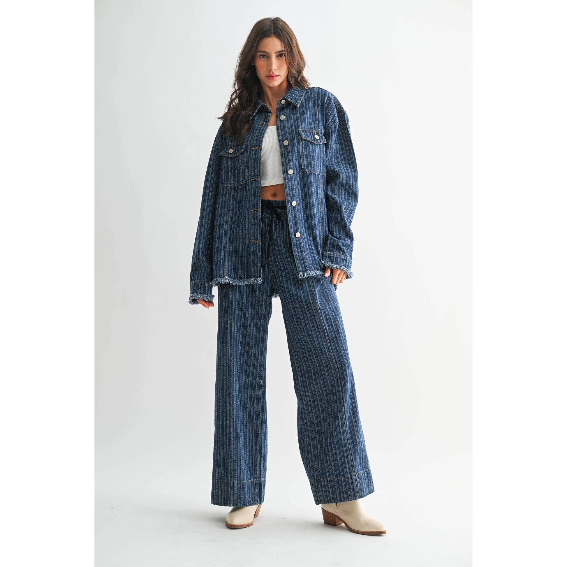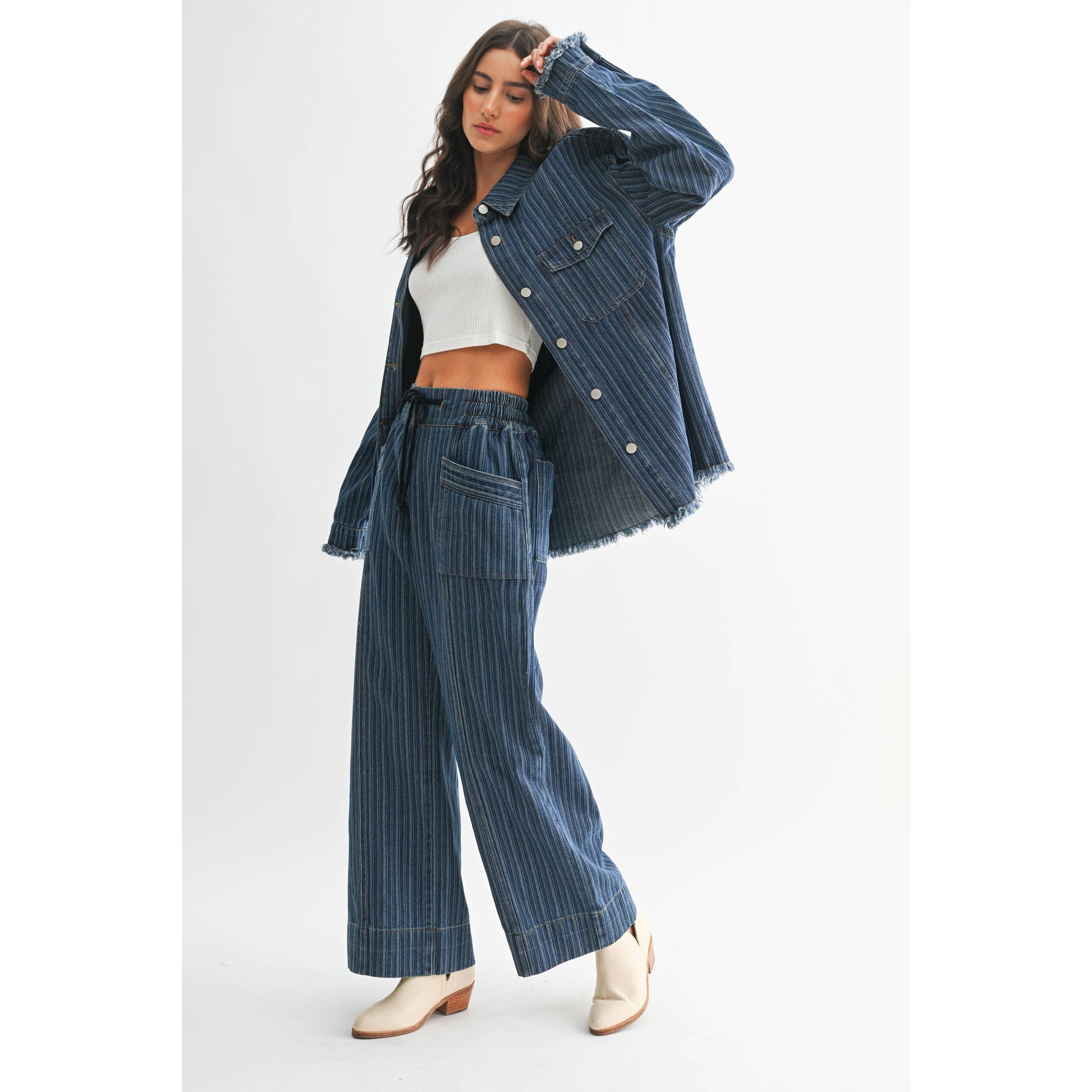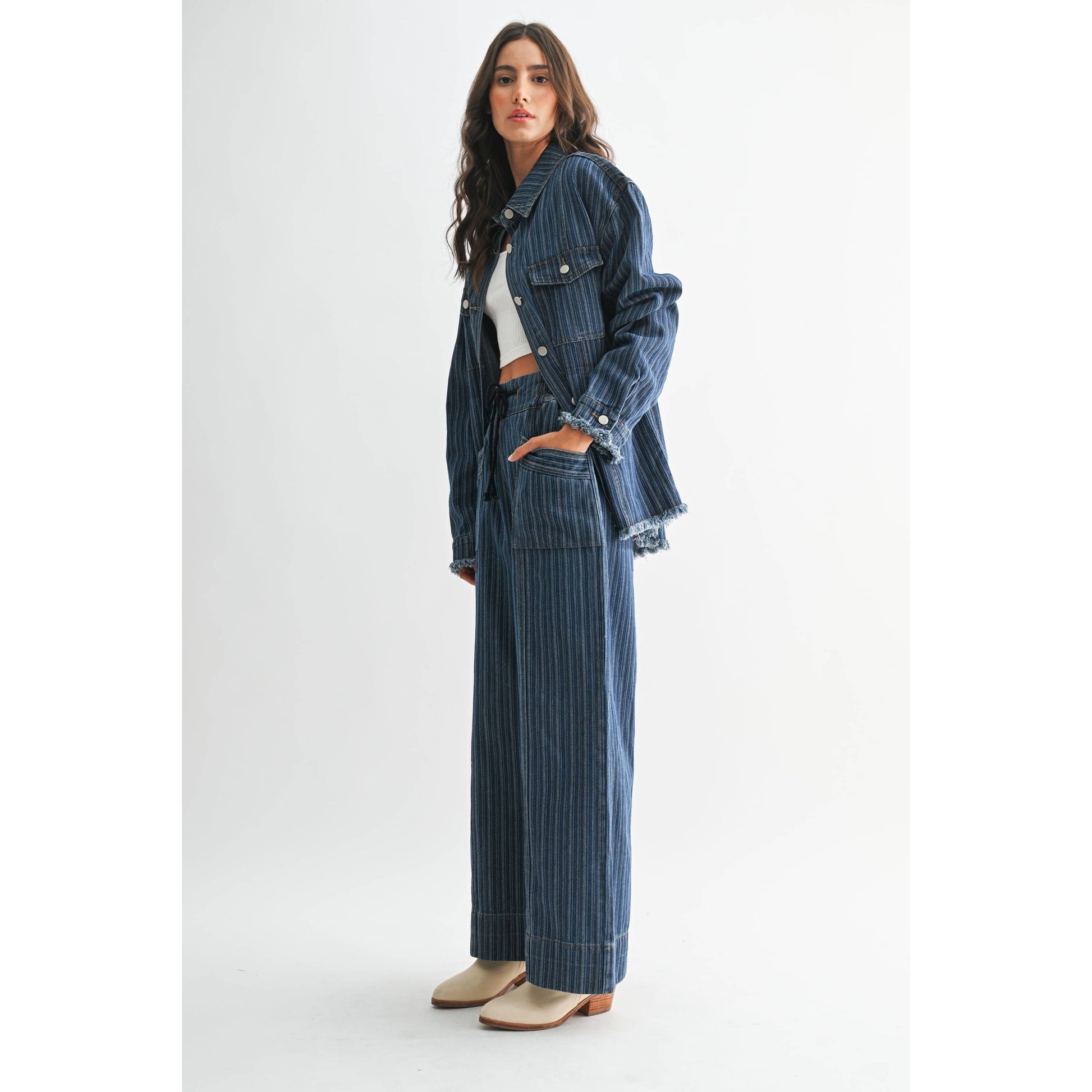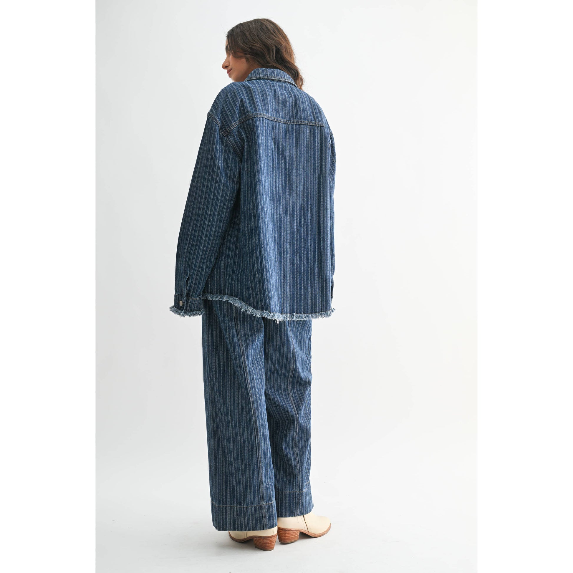 Elevate your wardrobe with this versatile striped denim jacket. Designed for both comfort and style, this jacket effortlessly enhances any casual look. Its durable fabric ensures long-lasting wear, while the relaxed fit provides easy layering options. Whether you're heading out for a quick errand or a weekend getaway, this jacket is the perfect companion.