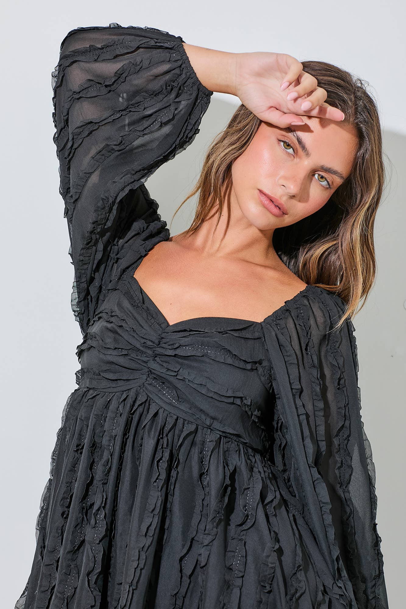 Ruffle texture, ruched bust, elastic waist and sleeve for comfort.