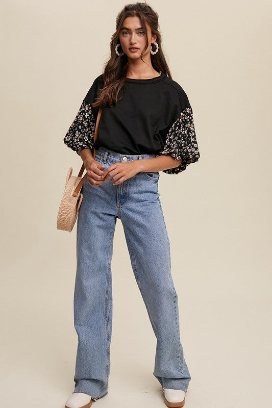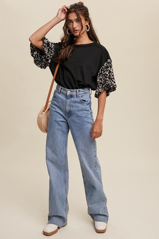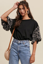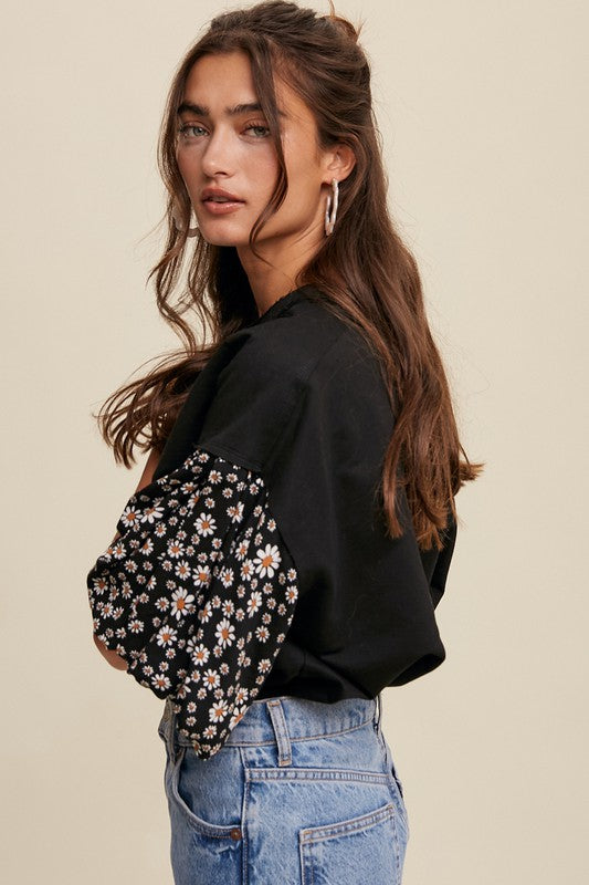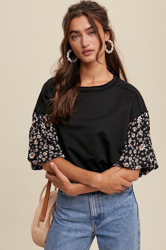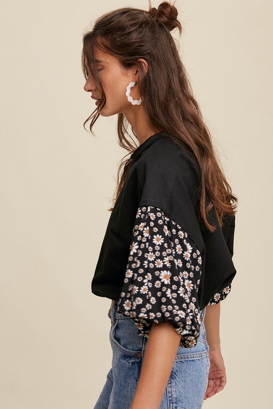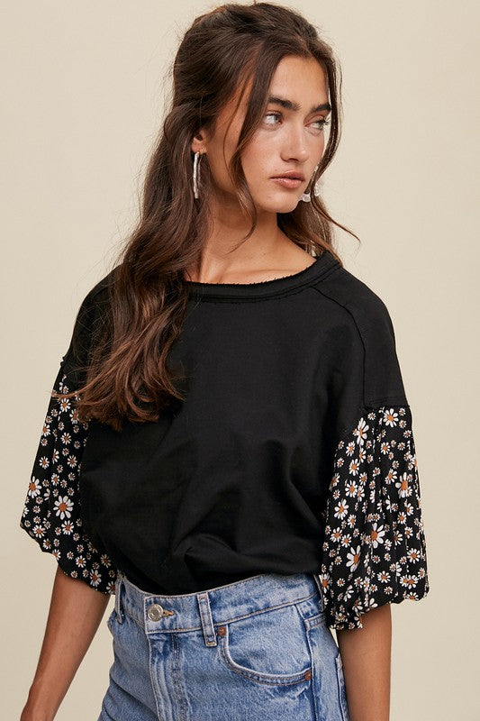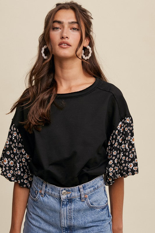 Thick cotton tee with contrast daisy print bubble sleeve.